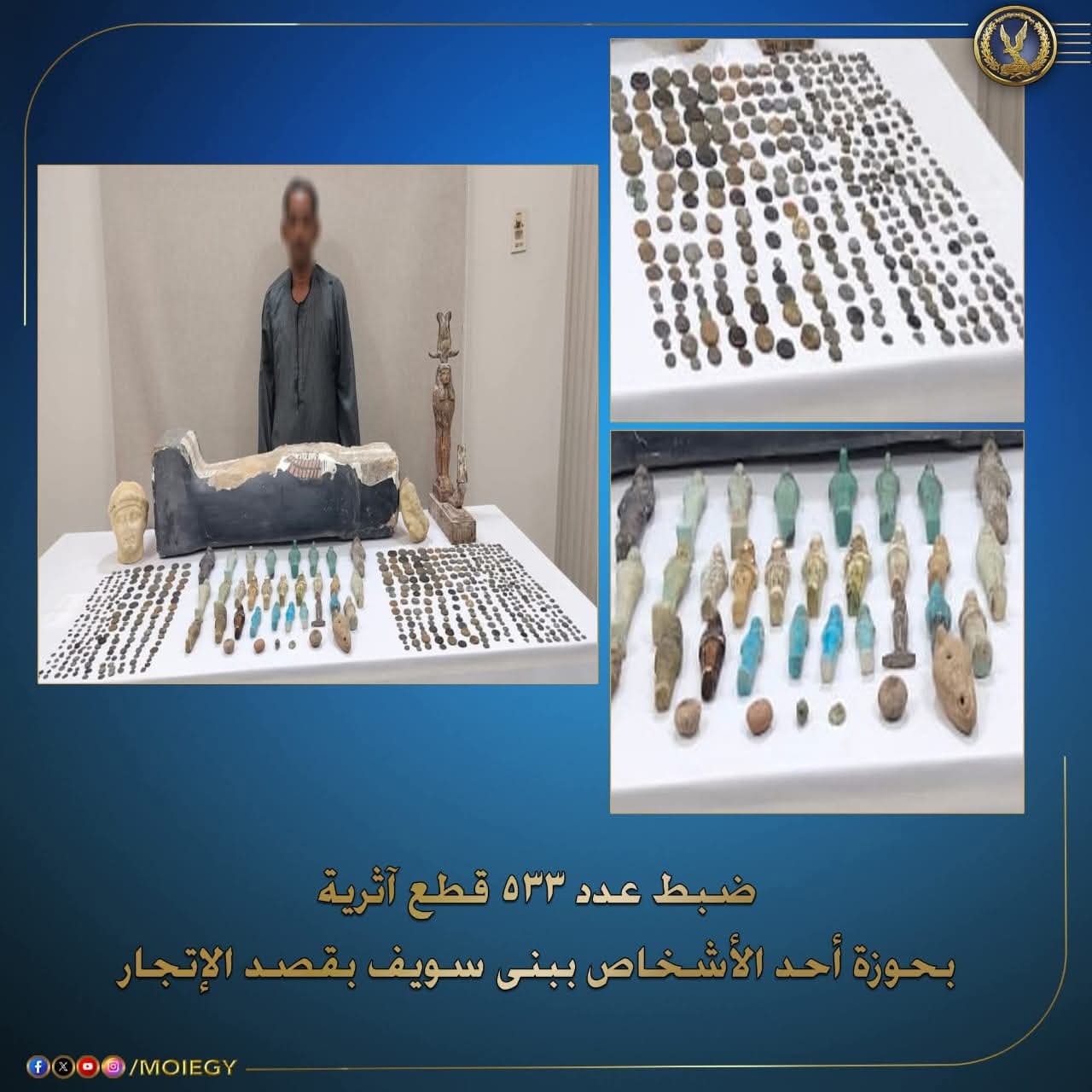 ضبط مزارع جنوب بنى سويف وبحوزته 533قطعه اثريه..صور