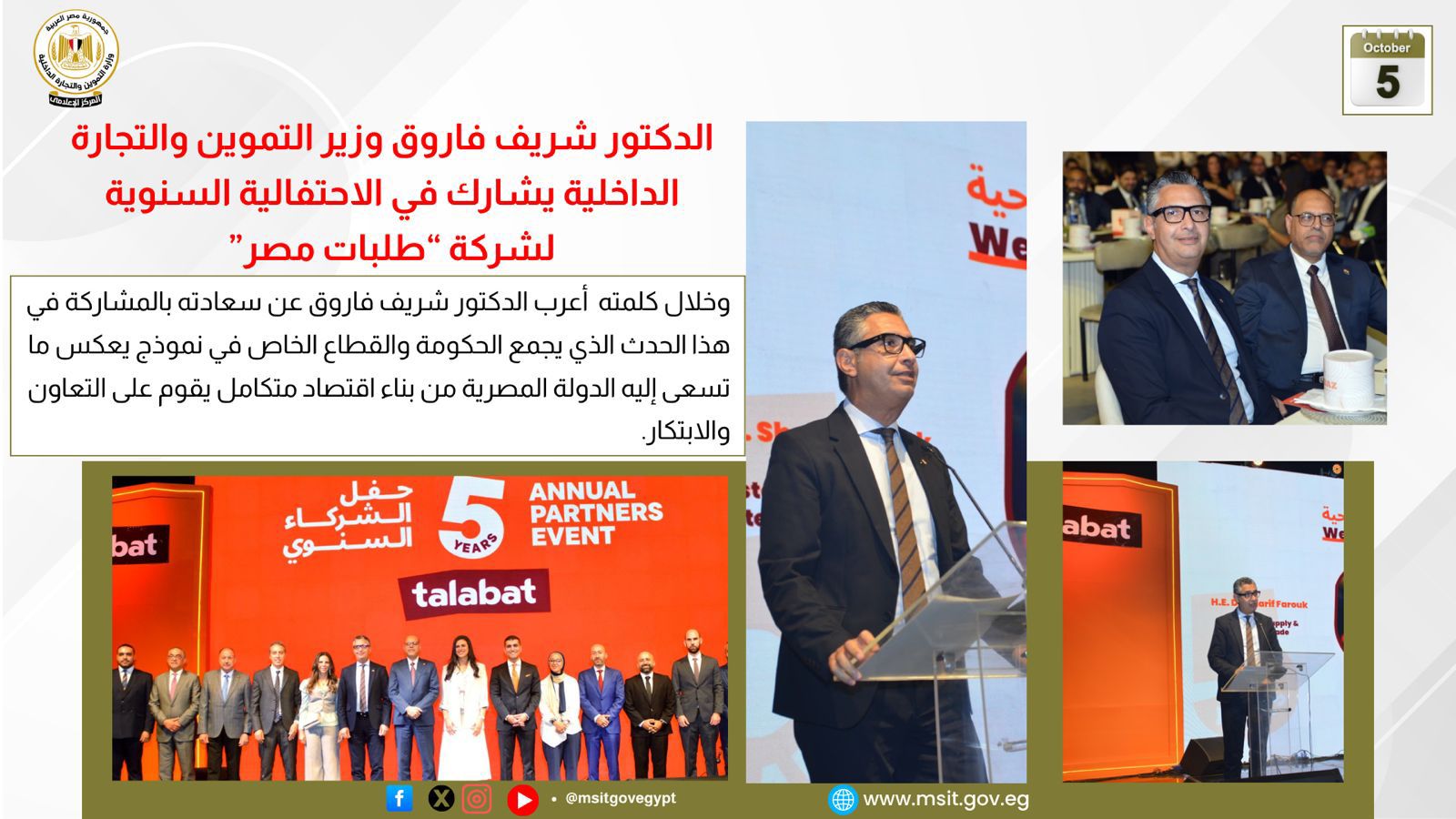 كما شارك وزير التموين والتجارة الداخلية في الاحتفالية السنوية لشركة “طلبات مصر”، بحضور قيادات الشركة وعدد من الشخصيات العامة، مؤكدًا أهمية الشراكة بين الدولة والقطاع الخاص في دعم منظومة الخدمات اللوجستية والغذائية وتعزيز الاقتصاد الوطني