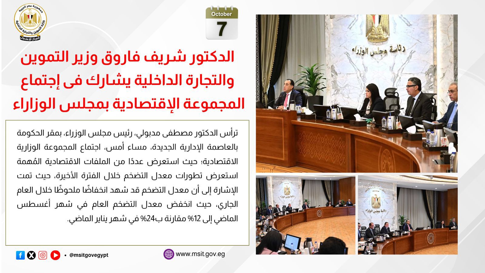شارك الدكتور شريف فاروق في اجتماع اللجنة الاقتصادية برئاسة الدكتور مصطفى مدبولي رئيس مجلس الوزراء، بمقر الحكومة بالعاصمة الإدارية، حيث تم استعراض عدد من الملفات الاقتصادية المهمة ذات الصلة بالأمن الغذائي والتجارة الداخلية