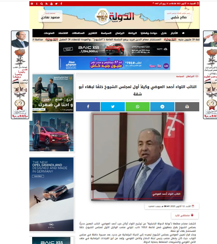 لقراءة الخبر إضغط هنا النائب اللواء أحمد العوضي وكيلاً أول لمجلس الشيوخ خلفًا لبهاء أبو شقة https://www.aldawlanews.com/1297284