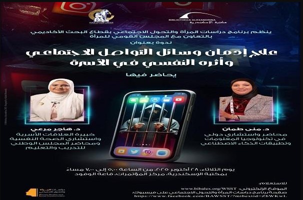 تنظم مكتبة الإسكندرية من خلال برنامج دراسات المرأة والتحول الاجتماعي بقطاع البحث الأكاديمي، بالتعاون مع المجلس القومي للمرأة، ندوة بعنوان "علاج إدمان وسائل التواصل الاجتماعي وأثره النفسي على الأسرة"، وذلك يوم الثلاثاء الموافق 28 أكتوبر 2025 من الساعة الخامسة حتى السابعة مساءً، في قاعة الوفود بمركز المؤتمرات.