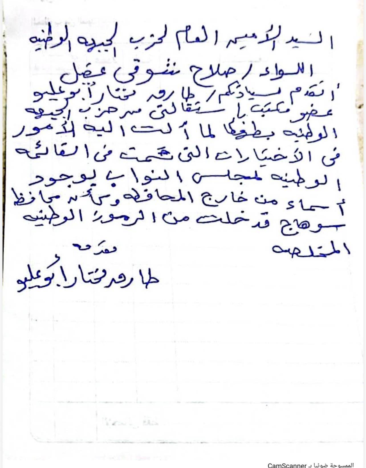 استقالة طارق مختار محمد محمود ابوعليو من حزب الجبهة الوطنية بسوهاج