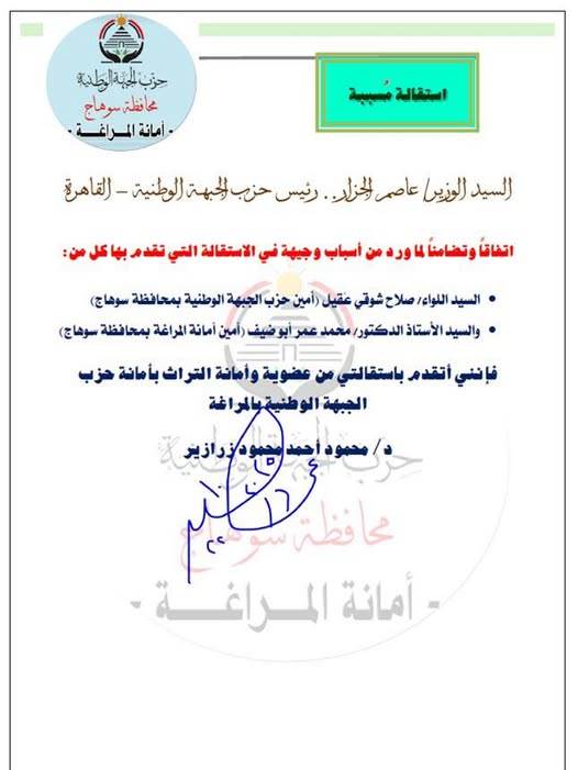 استقالة الدكتور محمود أحمد محمود أحمد زرازير من أمانة التراث بحزب الجبهة الوطنية بسوهاج