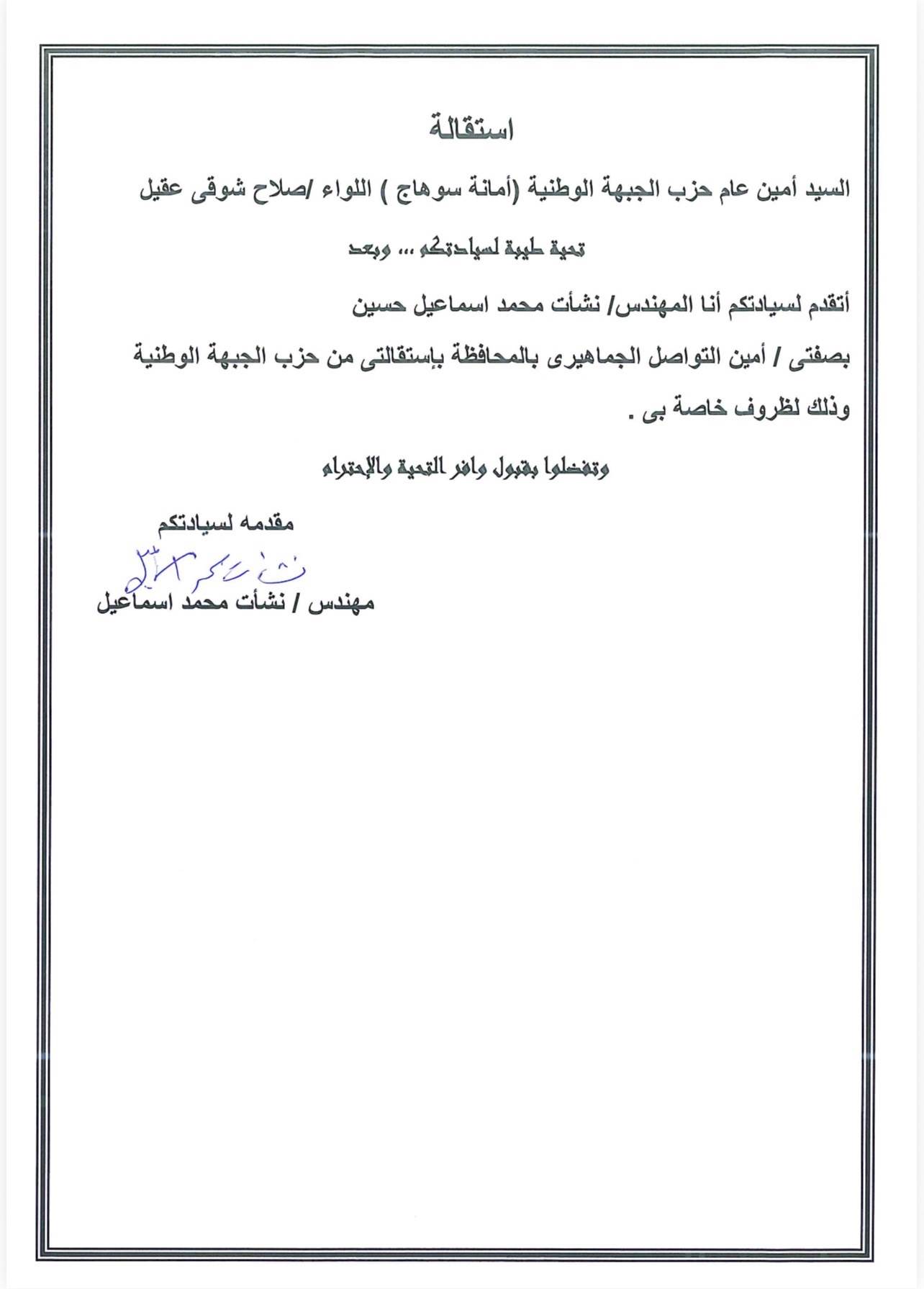 استقالة المهندس نشأت محمد إسماعيل أبوسيدين أمين أمانة التواصل الجماھیري بحزب الجبهة الوطنية