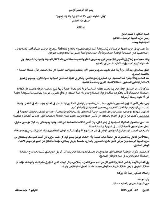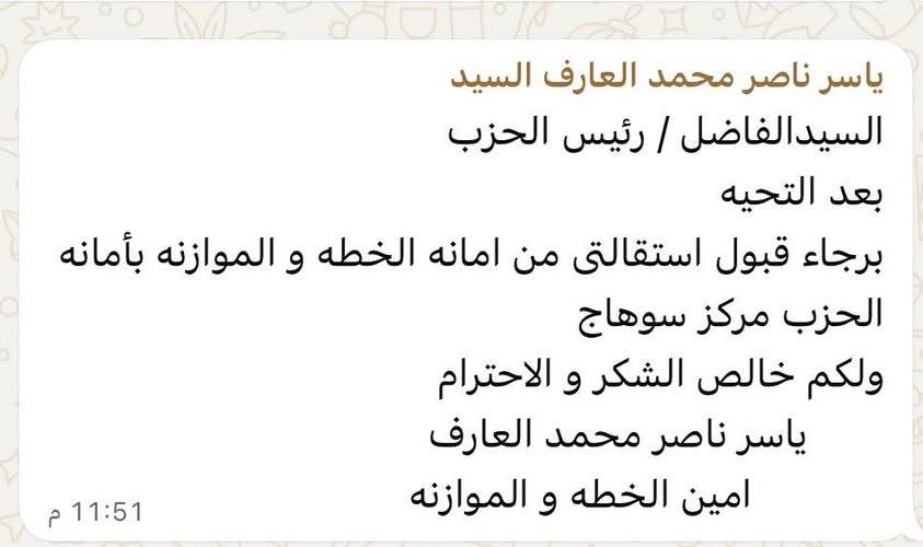 استقالة أمين الخطة والموازنة بحزب الجبهة الوطنية بسوهاج
