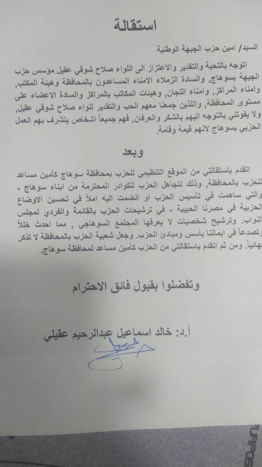 استقالة الدكتور خالد عقيلي من منصبه كأمين مساعد حزب الجبهة الوطنية بسوهاج