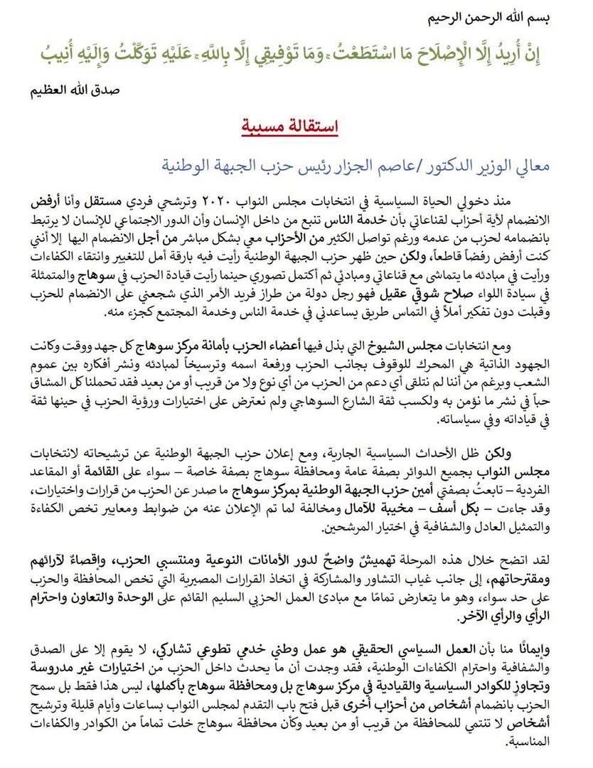 وتابع: "تفاجأنا بتمثيلٍ هزيلٍ في استحقاق مجلس الشيوخ، فحلمنا بأن يُعوَّض بتمثيلٍ لائقٍ ومناسبٍ في استحقاق مجلس النواب، إلا أننا صُدمنا بتمثيلٍ سيئٍ فيه، تمثيلٍ يُقصي كوادرنا من رجالنا وسيداتنا بصورةٍ أفقدتنا الأمل والرجاء في تغييرٍ يليق بنا أو يحقق أدنى درجات آمالنا وطموحاتنا. أصابنا جميعًا الإحباط واليأس بصورةٍ لم نستطع معها جميعًا إلا أن ننصرف عن هذا الحزب والقائمين عليه".