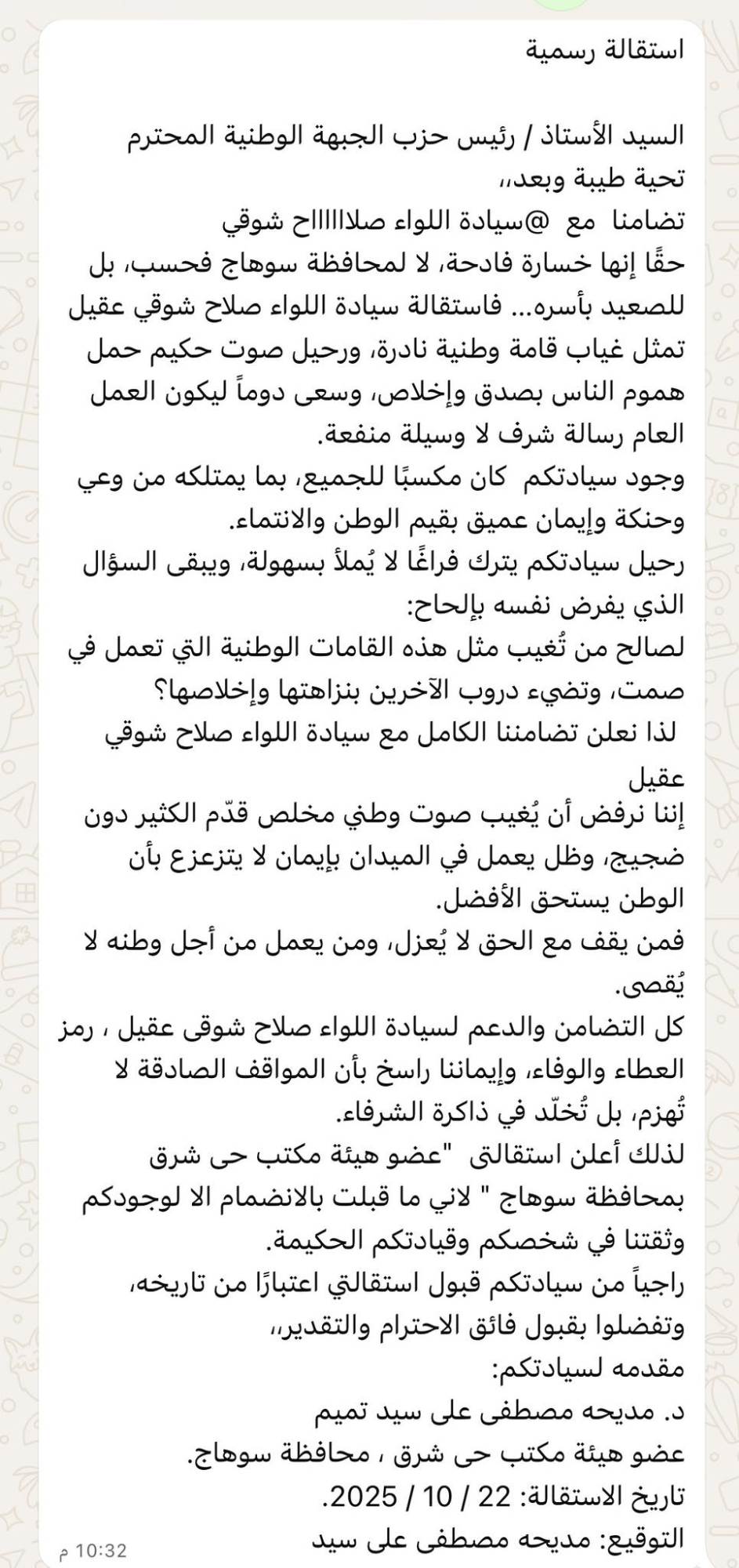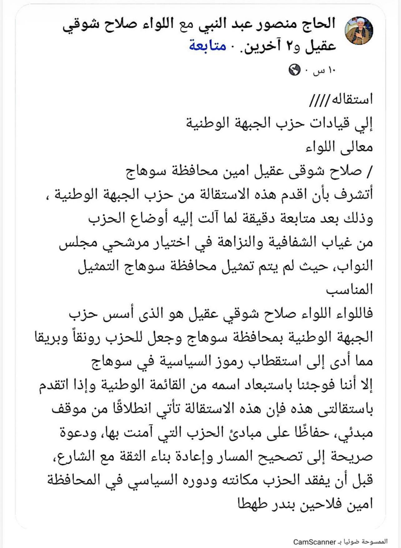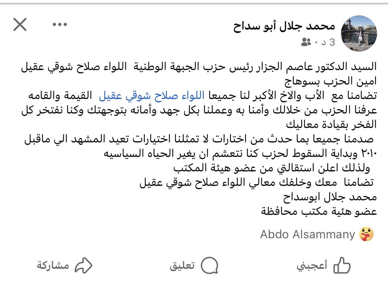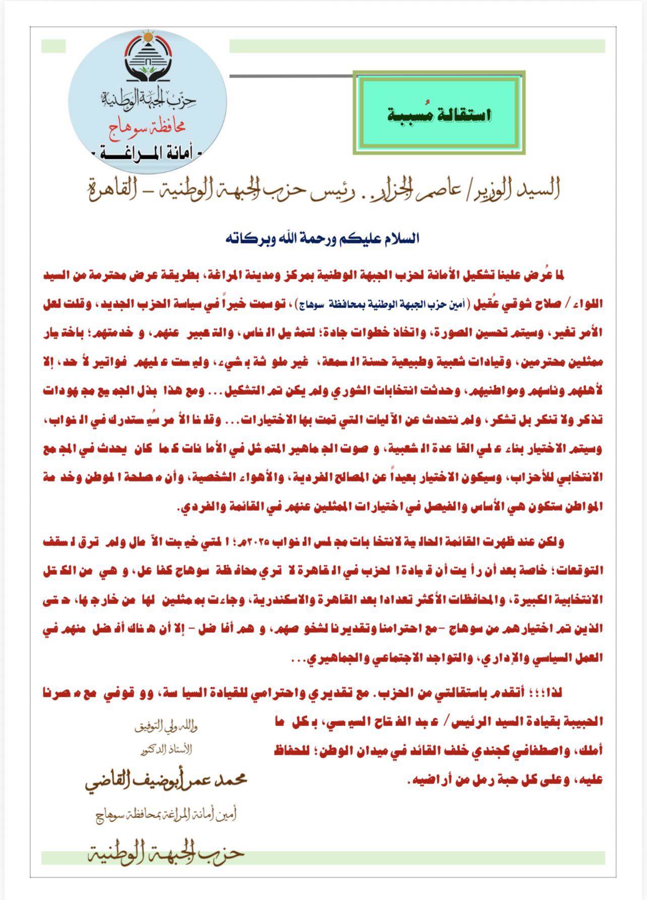 استقالة الدكتور أحمد حميد العمده أمين أمانة حزب الجبهة الوطنية بمركز سوهاج