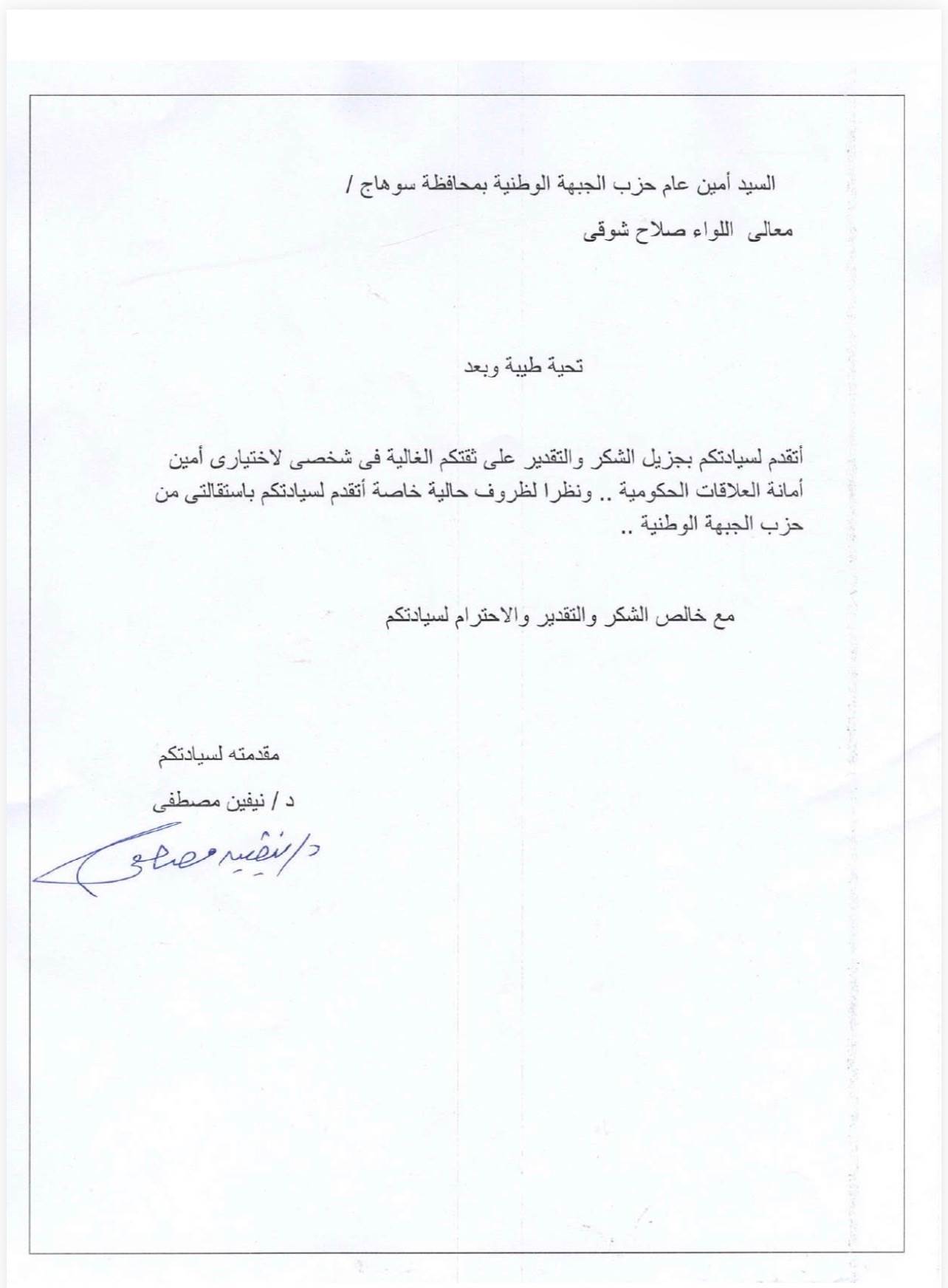 استقالة الدكتورة مديحة مصطفى على سيد من حزب الجبهة الوطنية سوهاج