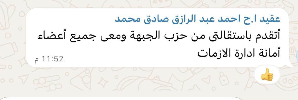 استقالة الدكتور محمد جلال عمر محمد سالمان وشهرته محمد ابو سداح عضو هيئة المكتب