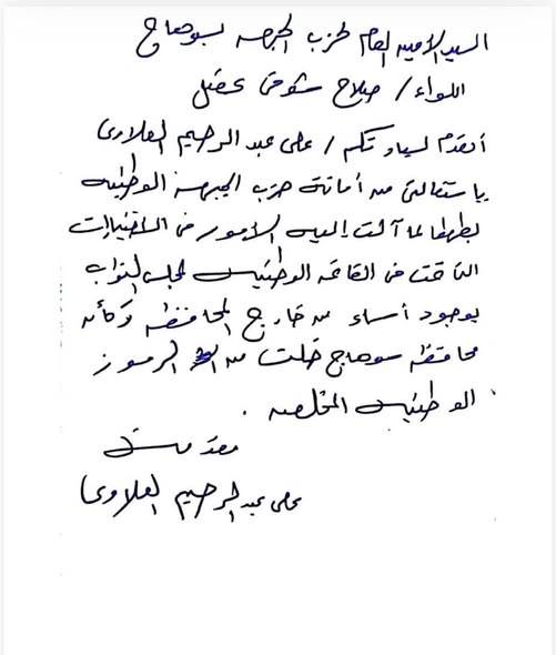 استقالة علي عبد الرحيم العلاوي من منصبه كعضو هيئة مكتب أمانة حزب الجبهة الوطنية سوهاج