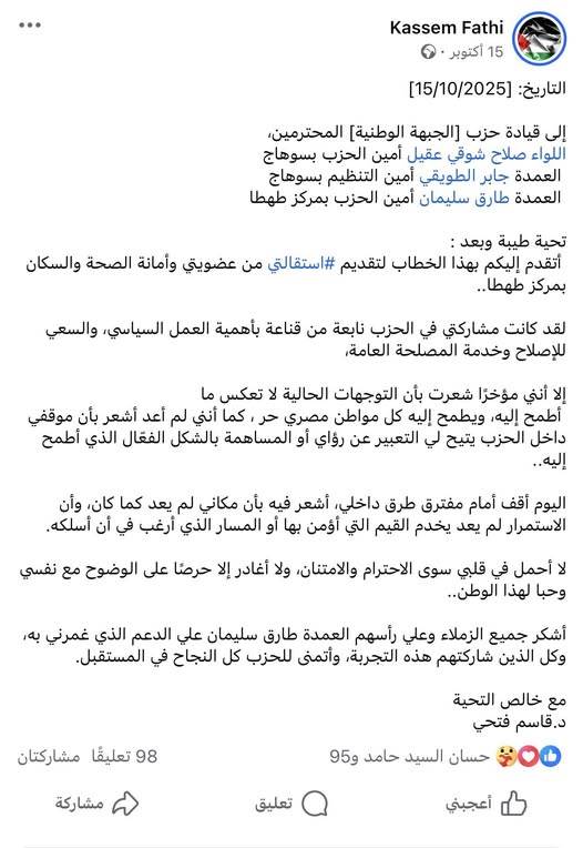 استقالة الدكتور قاسم فتحي السيد إبراهيم من حزب الجبهة الوطنية بسوهاج
