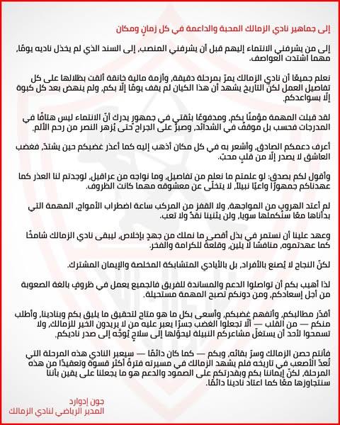 أصدر جون إدوارد المدير الرياضي لنادي الزمالك بيانًا رسميًا لجماهير القلعة البيضاء بعد الهجوم الذي تعرضت له إدارة الكرة.