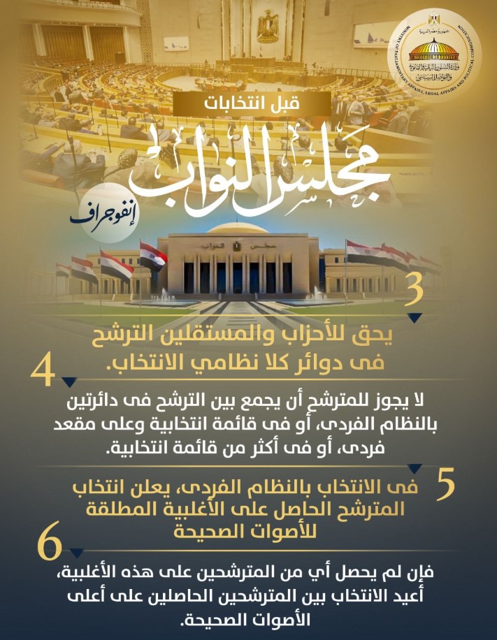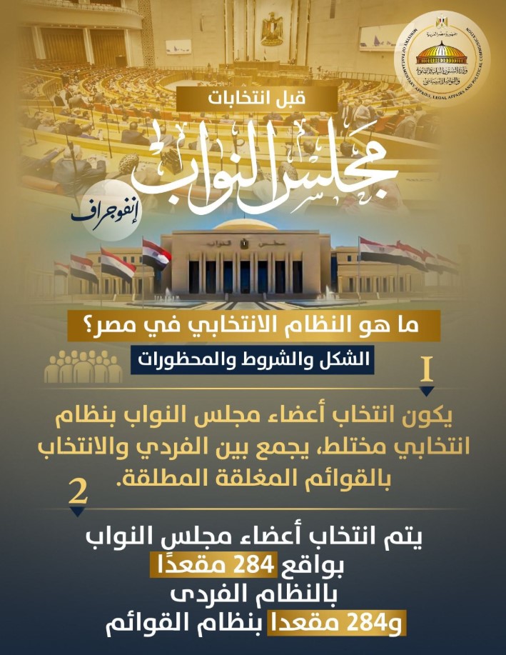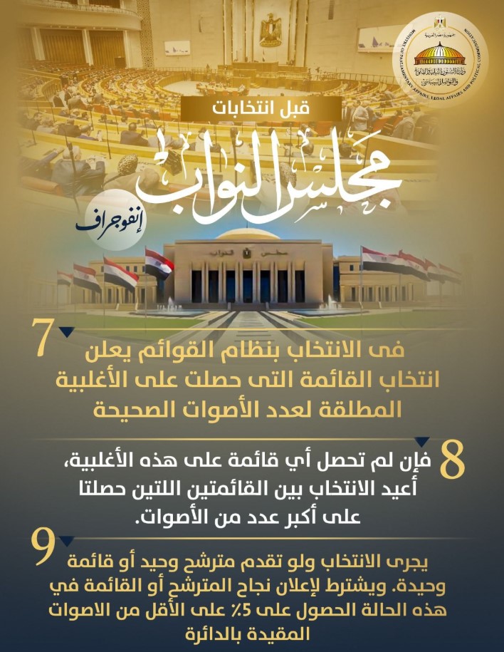 ونشرت الوزارة عدد من الإنفوجرافات حول انتخابات مجلس النواب وعدد أعضاء المجلس والفئات الممثلة في المجلس والمقاعد المخصصة لها.