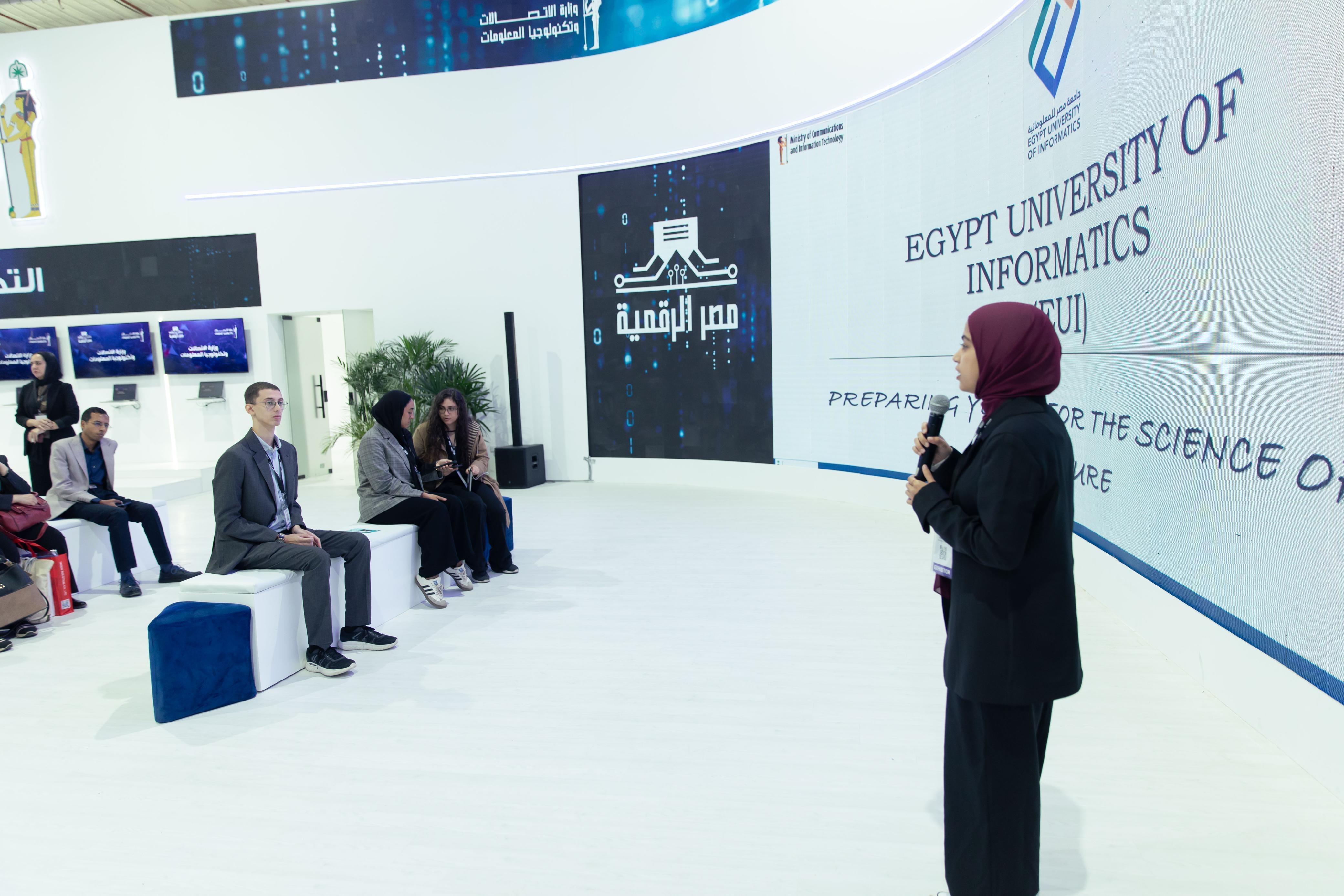 وعرضت المعيدة جهاد محمد عبد الرشيد عبد الرحمن بكلية علوم الحاسب والمعلومات تجربتها الدراسية حيث حصلت على شهادتي بكالوريوس مزدوج من جامعة مصر للمعلوماتية ومن جامعة "مينيسوتا" الأمريكية، واختيرت ضمن قائمة العميد للمتفوقين، وتخرجت بدرجة امتياز مع مرتبة الشرف من مصر للمعلوماتية ومينيسوتا، وكانت من أوائل خريجيها، وخلال فترة دراستها، عملت في مشروعين بحثيين متعلقين بعلم البيانات المكانية، وبعد تخرجها عملت لفترة متدربة في علم البيانات بإحدى شركات التكنولوجيا المالية.