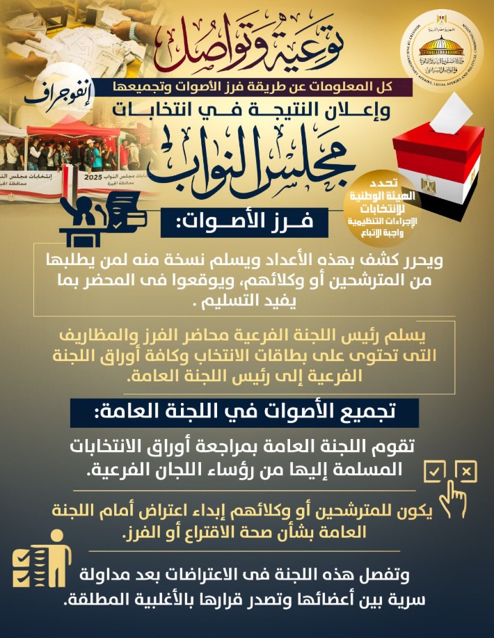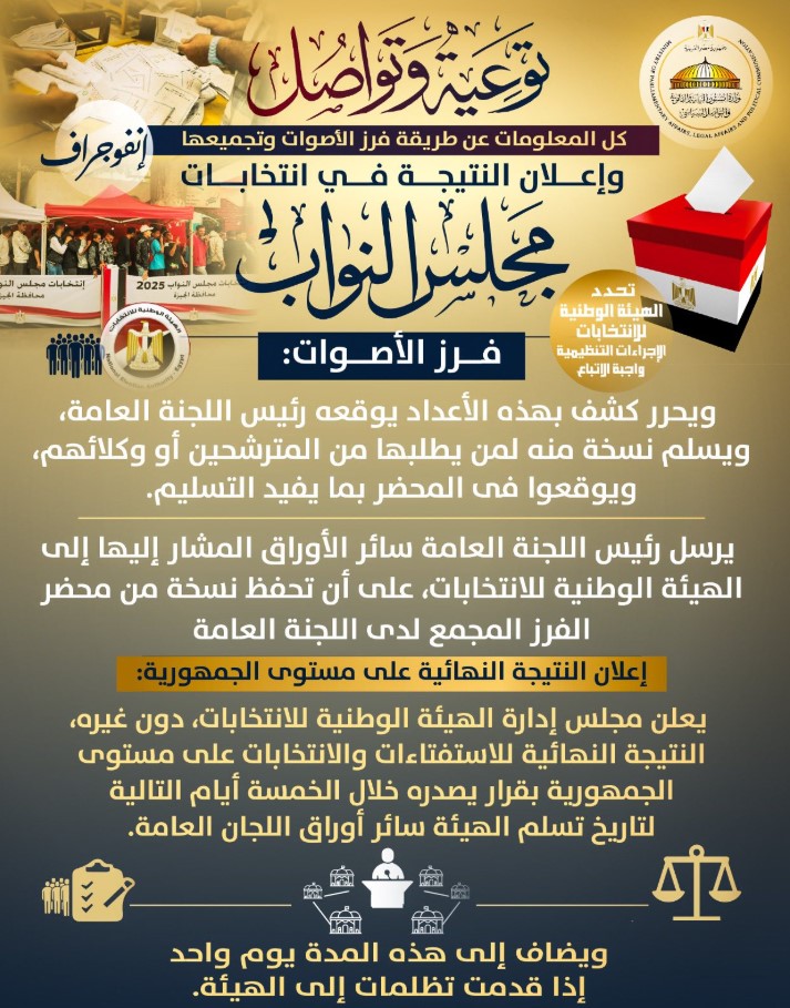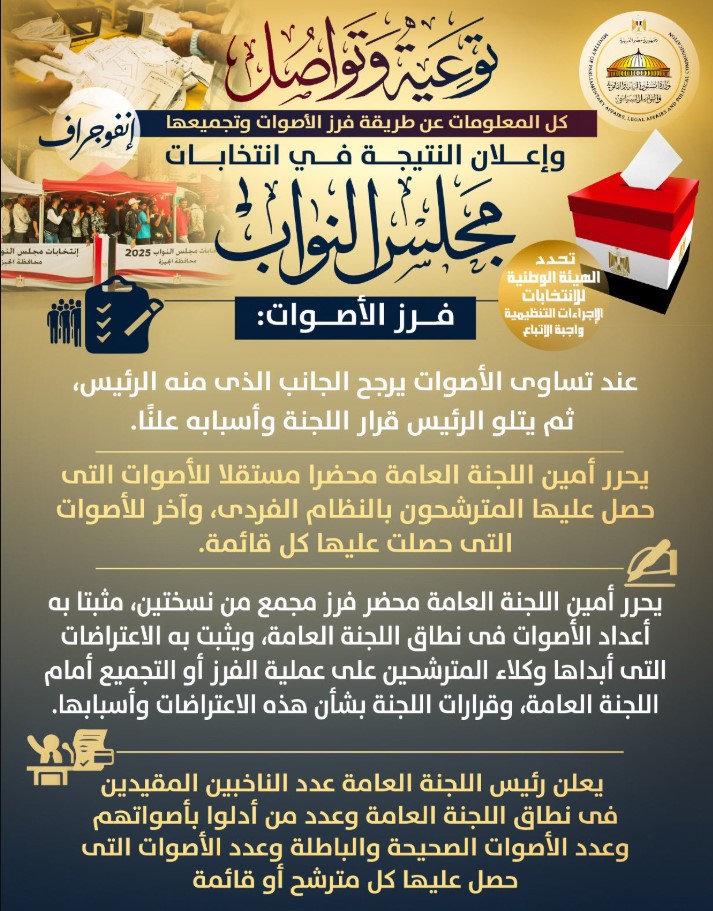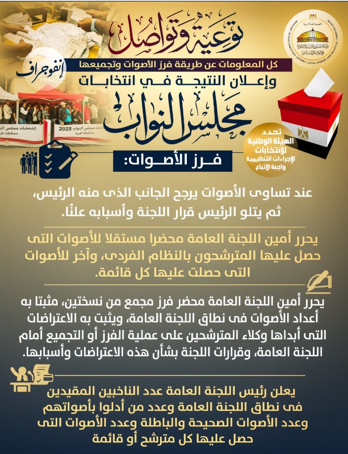 إنفوجراف| دليل وزارة الشؤون القانونية لفرز وتجميع أصوات انتخابات النواب 2025