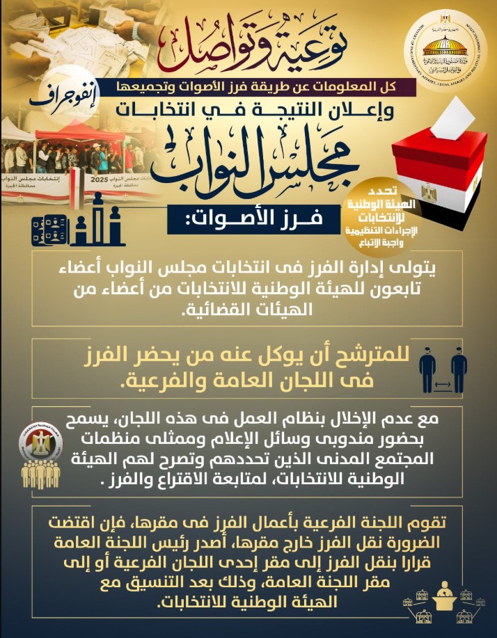 تحت شعار "توعية وتواصل"، نشرت وزارة الشؤون النيابية والقانونية والتواصل السياسي اليوم، إنفوجراف، قدمت فيها معلومات بشأن كل ما يتعلق بعمليات فرز الأصوات، وذلك بالتزامن مع اليوم الثاني والأخير في انتخابات المرحلة الثانية، لمجلس النواب 2025.