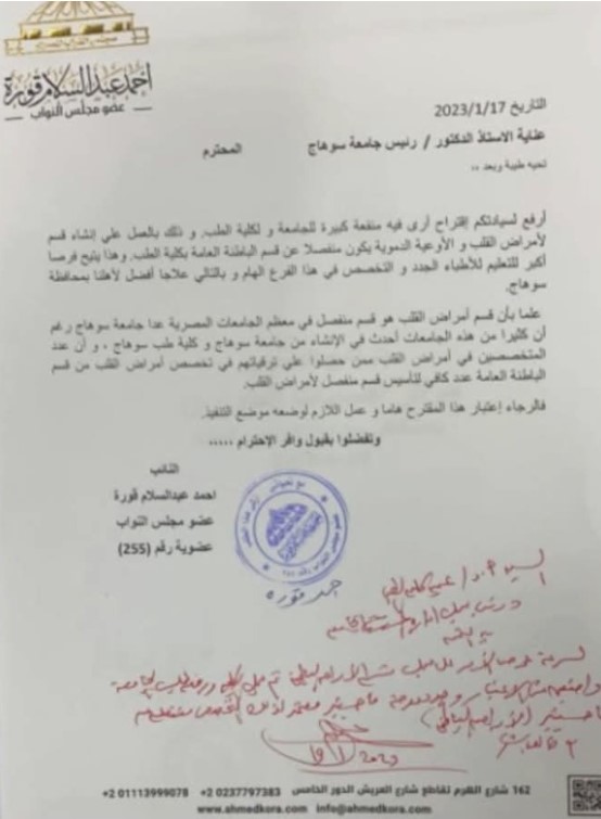 أعلنت جامعة سوهاج برئاسة الدكتور حسان النعماني إنشاء قسم مستقل لأمراض القلب والأوعية الدموية بكلية الطب، وذلك استجابة لطلب النائب البرلماني أحمد عبدالسلام قورة الذي تقدم باقتراح برغبة لفصل تخصص القلب عن قسم الباطنة العامة، في خطوة وصفها بأنها تأتي دعمًا مباشرًا للمنظومة الصحية داخل المحافظة.