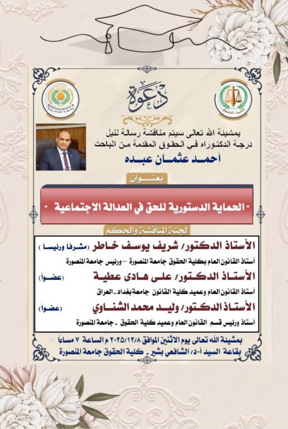 يذكر أن مناقشة الرسالة سيكون الاثنين المقبل بكلية الحقوق جامعة المنصورة، حيث تتكون لجنة المناقشة من الأستاذ الدكتور شريف يوسف خاطر أستاذ القانون العام بكلية الحقوق جامعة المنصورة ورئيس الجامعة”رئيسا”، وعضوية الأستاذ الدكتور على هادي عطية أستاذ القانون العام وعميد كلية القانون بجامعة بغداد، والأستاذ الدكتور وليد محمد الشناوي أستاذ ورئيس قسم القانون العام وعميد كلية حقوق المنصورة.