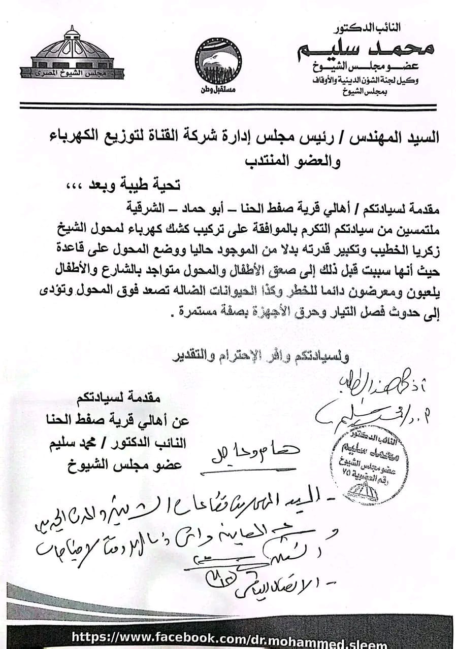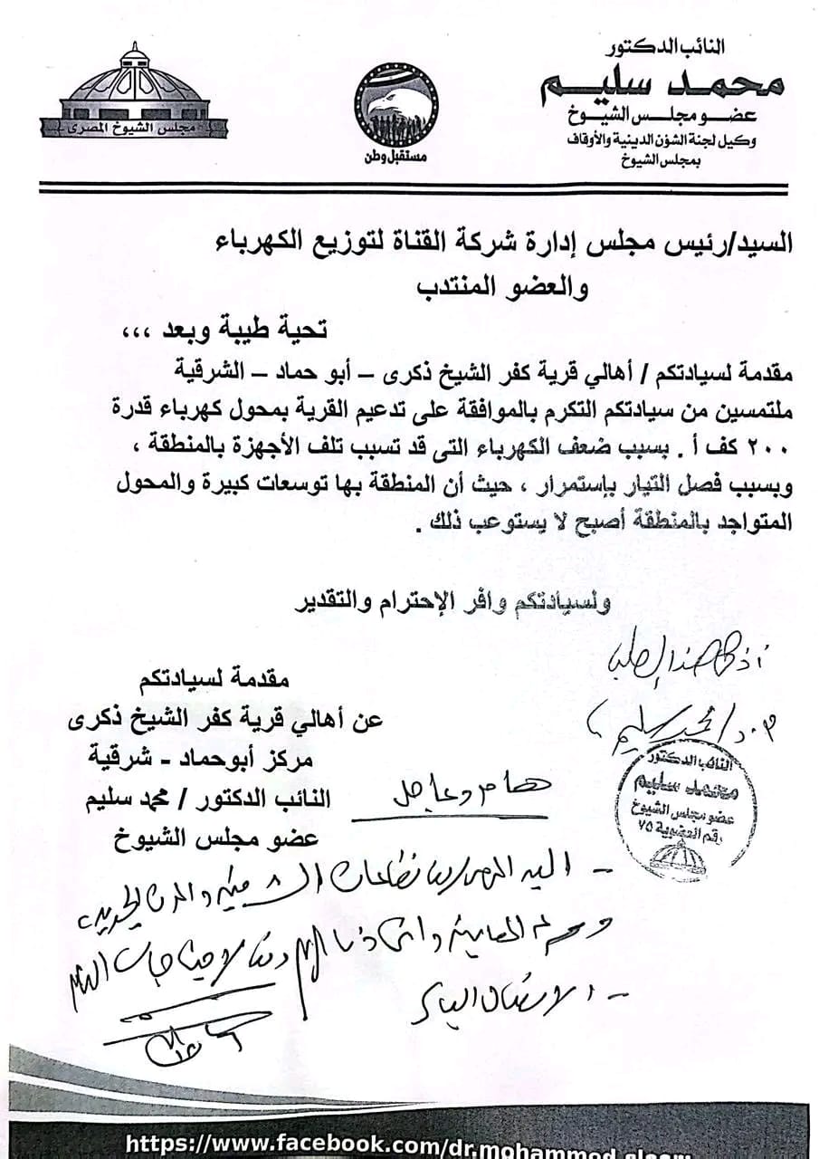 وكان الدكتور محمد سليم وكيل لجنة الشئون الدينية والأوقاف بمجلس الشيوخ وأمين عام حزب مستقبل وطن بالشرقية قد تقدم بالعديد من الطلبات لصرف محولات وزياده قدرة عدد من المحولات واحلال وتجديد أعمدة الكهرباء بقري مركز ومدينة أبوحماد للقضاء على مشكلة ضعف الكهرباء بسبب زيادة الأحمال.