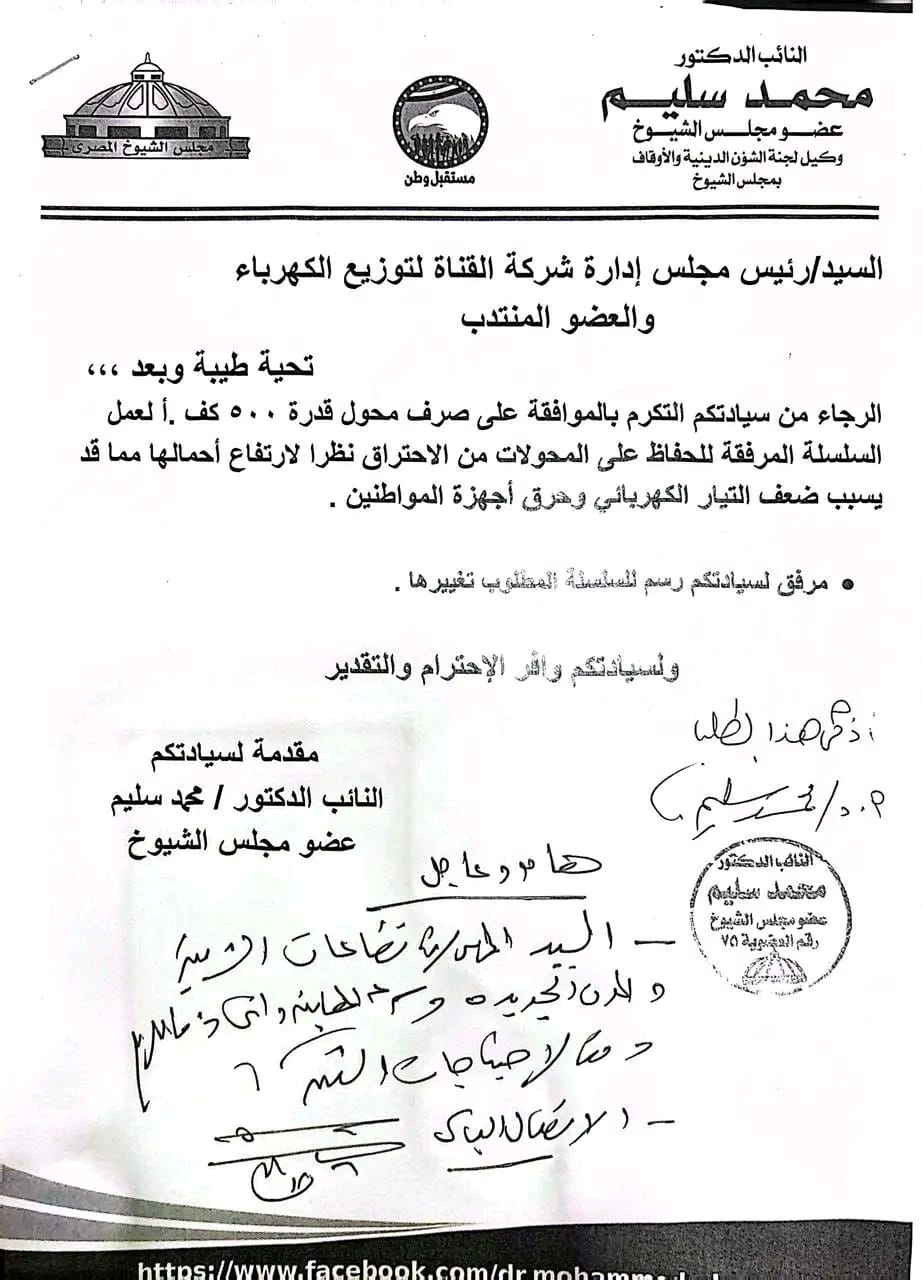 وكان الدكتور محمد سليم وكيل لجنة الشئون الدينية والأوقاف بمجلس الشيوخ وأمين عام حزب مستقبل وطن بالشرقية قد تقدم بالعديد من الطلبات لصرف محولات وزياده قدرة عدد من المحولات واحلال وتجديد أعمدة الكهرباء بقري مركز ومدينة أبوحماد للقضاء على مشكلة ضعف الكهرباء بسبب زيادة الأحمال.