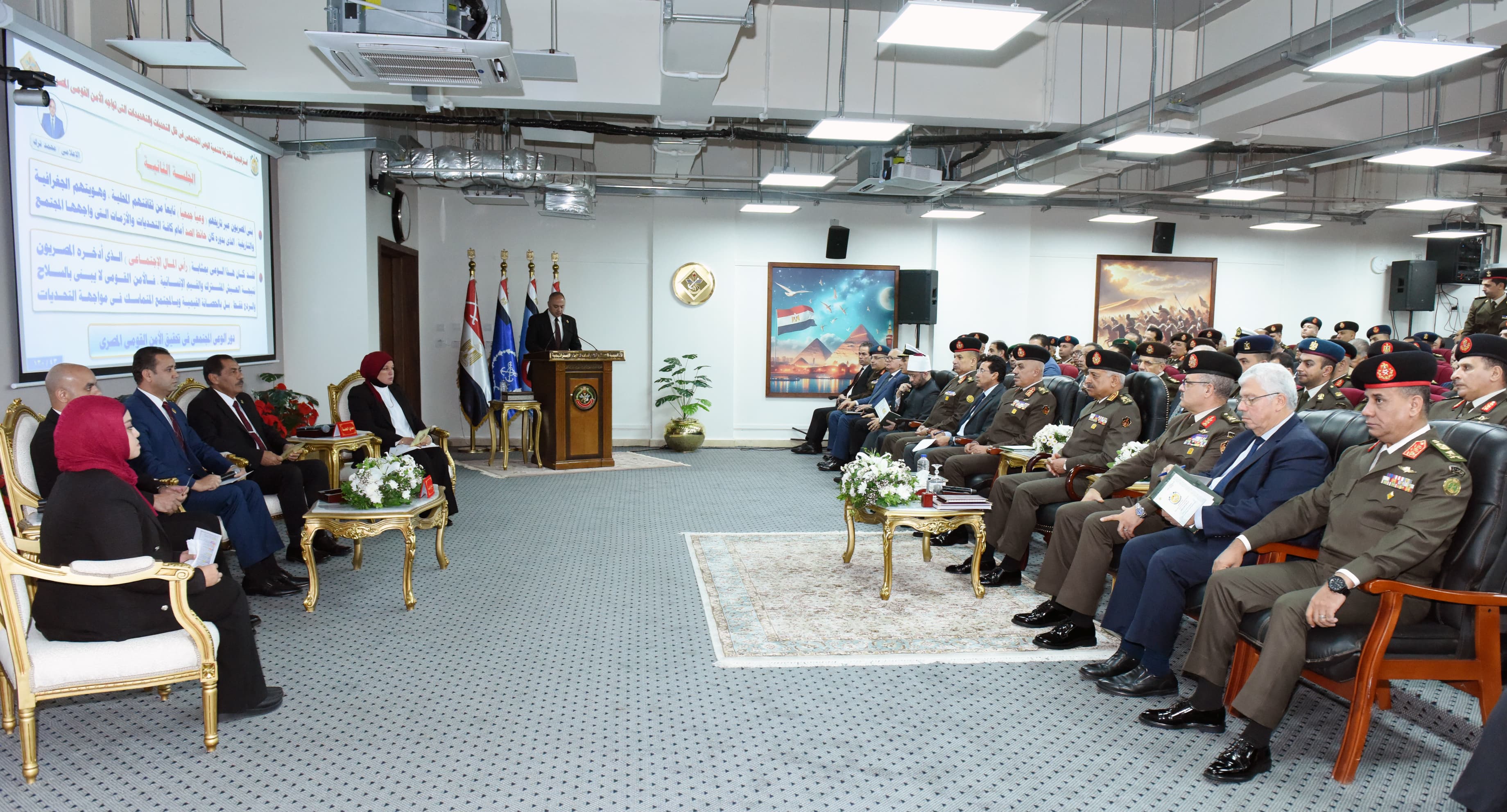 شهد الفريق أول عبد المجيد صقر القائد العام للقوات المسلحة وزير الدفاع والإنتاج الحربى مناقشة البحث الرئيسى للأكاديمية العسكرية للدراسات العليا والإستراتيجية بعنوان " إستراتيجية مقترحة لتنمية الوعى المجتمعى فى ظل التحديات والتهديدات التى تواجه الأمن القومى المصرى " ، والذى نفذته كلية الدفاع الوطنى ، وذلك بحضور الفريق أحمد خليفة رئيس أركان حرب القوات المسلحة وعدد من الوزراء وقادة الأفرع الرئيسية وعدد من قادة القوات المسلحة ورؤساء الجامعات والإعلاميين والشخصيات العامة .