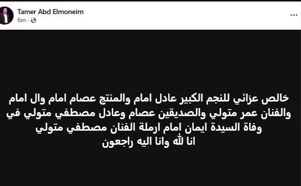 ونعي الفنان تامر عبد المنعم الراحلة قائلاً: "خالص عزائي للنجم الكبير عادل امام والمنتج عصام امام وال امام والفنان عمر متولي والصديقين عصام وعادل مصطفي متولي في وفاة السيدة ايمان امام ارملة الفنان مصطفي متولي".