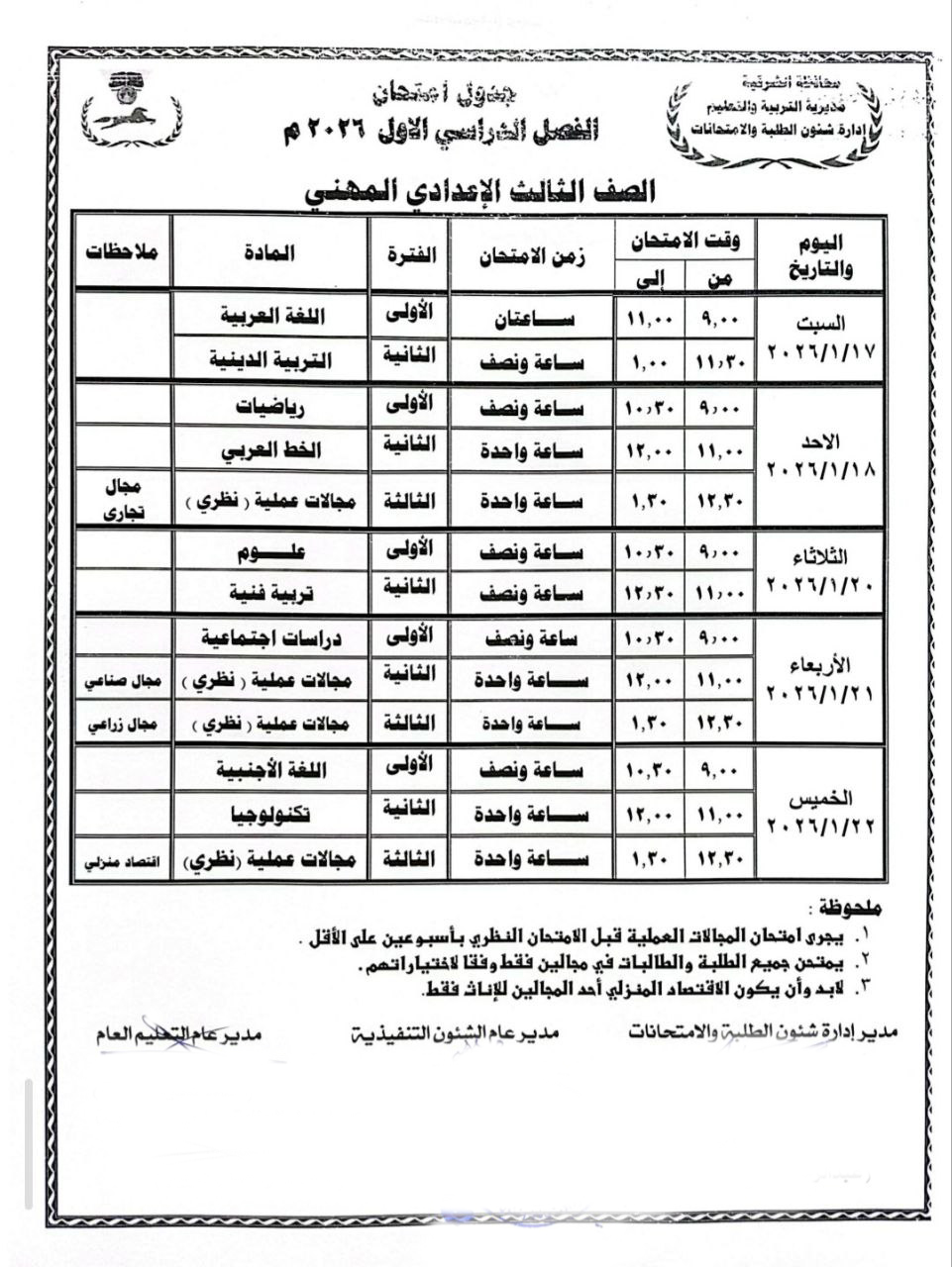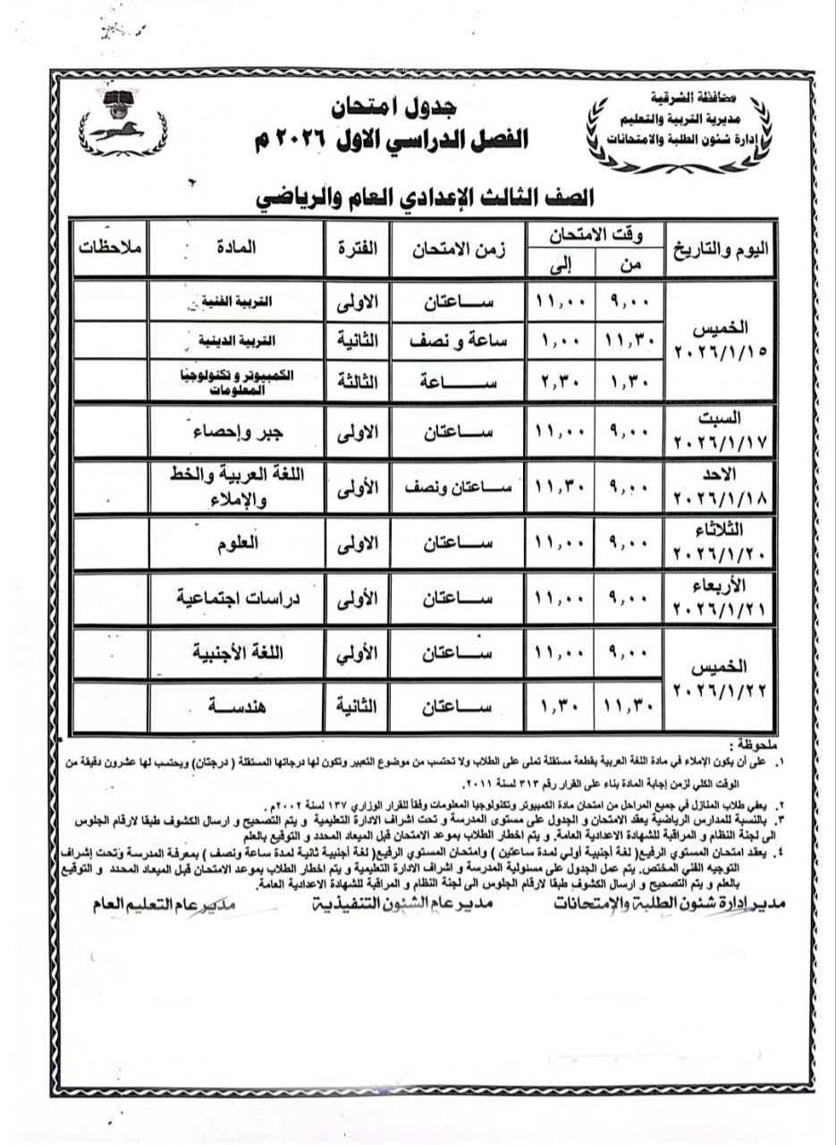 هذا وإعتمد المهندس حازم الأشموني محافظ الشرقية جدول إمتحانات الفصل الدراسي الأول للمرحلة الإعدادية للعام الدراسي ٢٠٢٥ / ٢٠٢٦ بجميع الإدارات التعليمية بنطاق المحافظة، والتي من المقرر أن تنطلق يوم الخميس الموافق ١٥ يناير وتستمر حتى يوم الخميس الموافق ٢٢ يناير ٢٠٢٦.