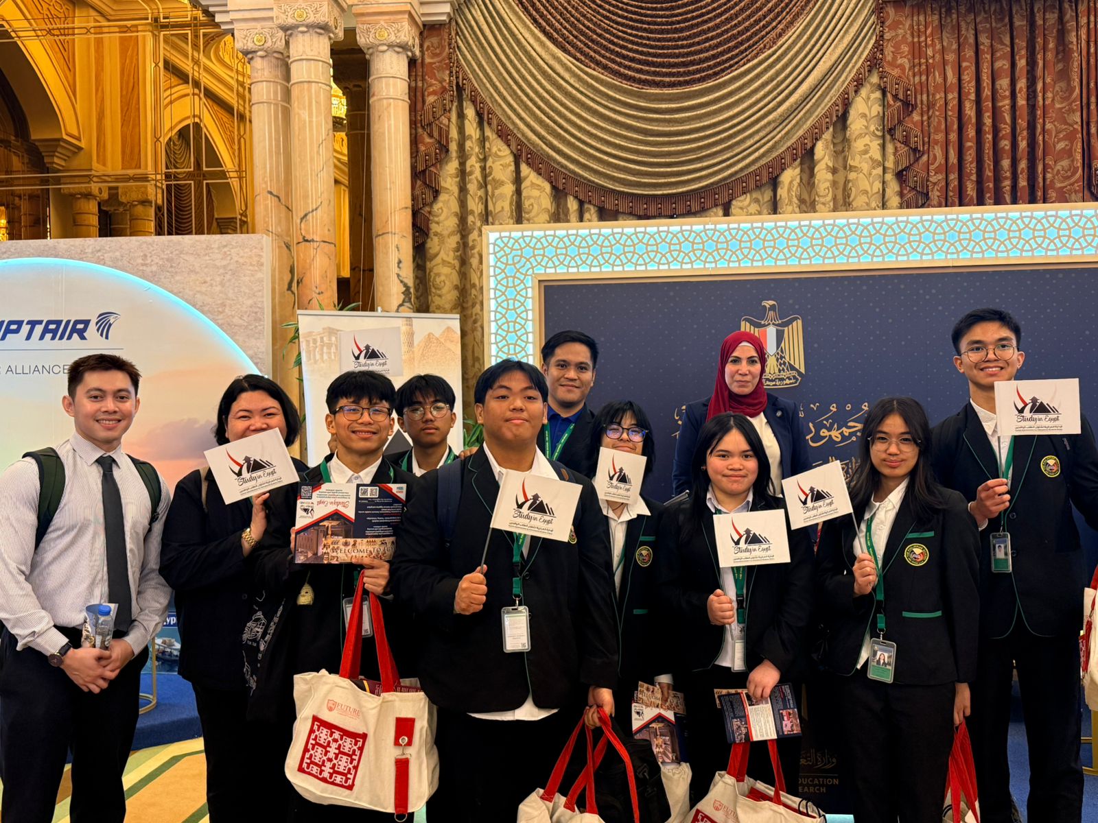 وشهد الافتتاح مشاركة وفد رفيع المستوى من وزارة التعليم العالي والبحث العلمي برئاسة الدكتور أحمد عبدالغني، وضم الوفد الدكتور صالح هاشم رئيس جامعة عين شمس الأسبق ورئيس لجنة قطاع الدراسات اللغوية بالمجلس الأعلى للجامعات، والدكتور رامي ماهر نائب رئيس جامعة عين شمس لشؤون التعليم والطلاب، إلى جانب عدد من ممثلي الإدارة المركزية لشؤون الطلاب الوافدين، وممثلي الجامعات المصرية الحكومية والخاصة والأهلية وأفرع الجامعات الدولية، فضلًا عن جامعات إماراتية وطلاب المدارس بدولة الإمارات.