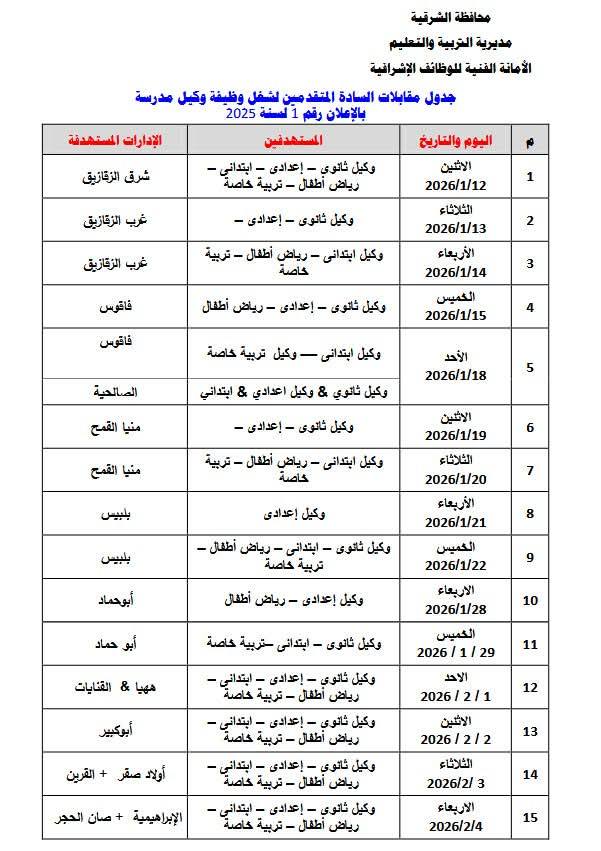 واوضح رمضان ان مديرية التربية والتعليم بالشرقية تهيب بالمتقدمين لشغل هذه الوظائف والمنشورة أسماءهم الحضور في المواعيد المحددة يوم الخميس الموافق 22 يناير 2026 بمركز التطوير التكنولوجي بالمديرية لإجراء اختبار اللغة الانجليزية والحاسب الآلي ثم الانتظار بمسرح مدرسة الزقازيق الثانوية العسكرية حتي الساعة الثالثة بعد العصر لحضور اختبارات المقابلة الشخصية طبقا للكشف رقم 1 & 2