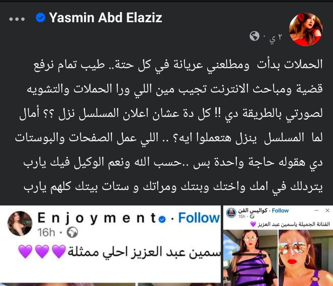 ونشرت ياسمين صورًا لبعض الصفحات التي أساءت لها عبر حسابها الرسمي على موقع "فيس بوك"، وكتبت: "الحملات بدأت ومطلعني عريانة في كل حتة.. طيب تمام نرفع قضية ومباحث الإنترنت تجيب مين اللي ورا الحملات والتشويه لصورتي بالطريقة دي !! كل دة عشان اعلان المسلسل نزل ؟؟ أمال لما المسلسل ينزل هتعملوا ايه؟"