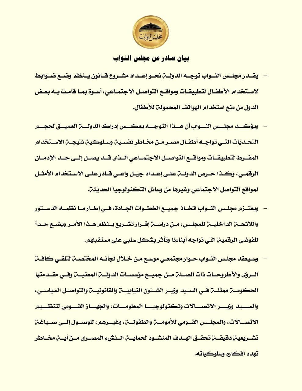 أصدر مجلس النواب بيانًا أعرب فيه عن تقديره لتوجه الدولة نحو إعداد مشروع قانون ينظم وضع ضوابط لاستخدام الأطفال لتطبيقات ومواقع التواصل الاجتماعي، أسوة بتجارب دولية اتجهت إلى تقييد استخدام الهواتف المحمولة للأطفال.