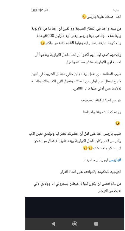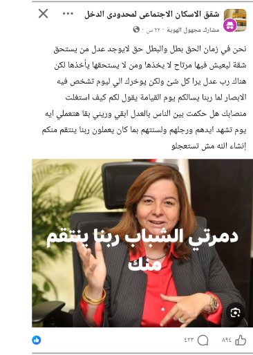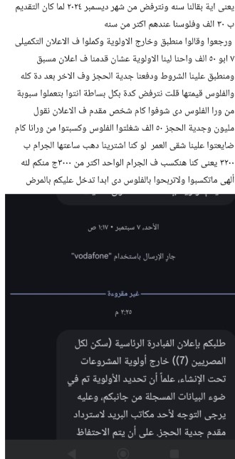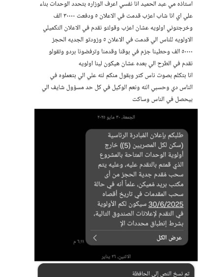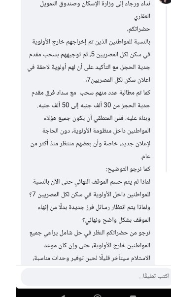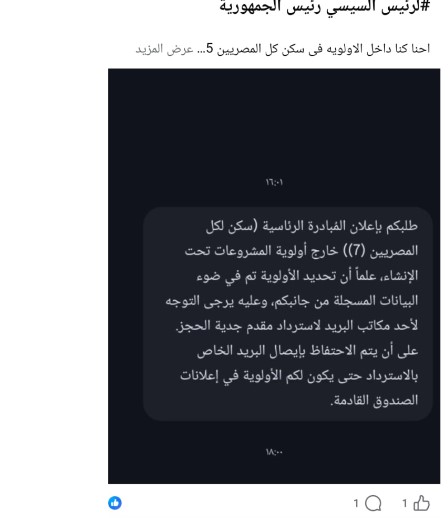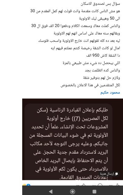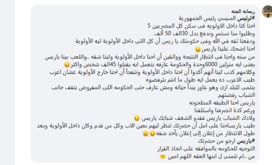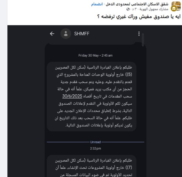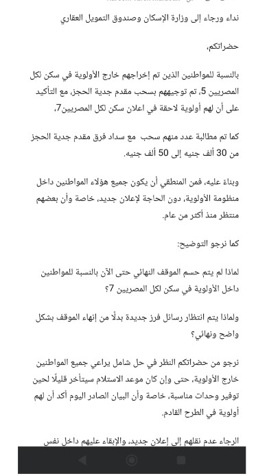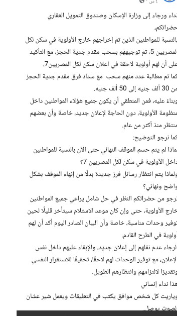 وناشدا المواطنين فخامة الرئيس عبد الفتاح السيسي، رئيس الجمهورية، التدخل العاجل لوقف هذا التعسف الإداري وفتح تحقيق شفاف في قرارات صندوق الإسكان الاجتماعي، ومحاسبة المسؤولين عن إهدار حقوق المواطنين والإبقاء على جميع من سبق وعدهم بالأولوية داخل نفس الإعلان، دون إجبارهم على الدخول في إعلانات جديدة بشروط وأعباء إضافية وتوفير وحدات سكنية لهم حتى وإن تأخر التسليم، تحقيقًا للاستقرار النفسي والاجتماعي.