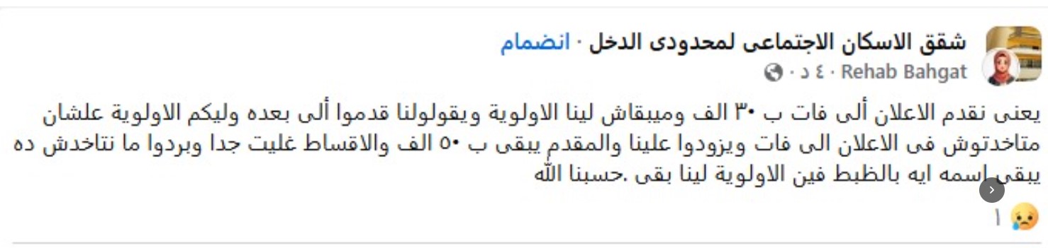 وقالت إحدى المتقدمات، وهي مطلقة وتعول أطفالًا: «استوفيت كل الشروط، ودفعت المبالغ المطلوبة، وفوجئت بكوني خارج الأولوية، رغم أنني من الفئات الأولى بالرعاية. لا نعرف على أي أساس يتم الاختيار».