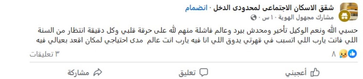 فيما تساءل شاب أعزب تقدم للإعلان الخامس ثم التكميلي 7: «قيل لنا إننا أصحاب أولوية بعد زيادة مقدم الحجز، والتزمنا بذلك، ثم جاءت النتيجة عكس ما وُعدنا به تمامًا. هذا أمر غير مفهوم».