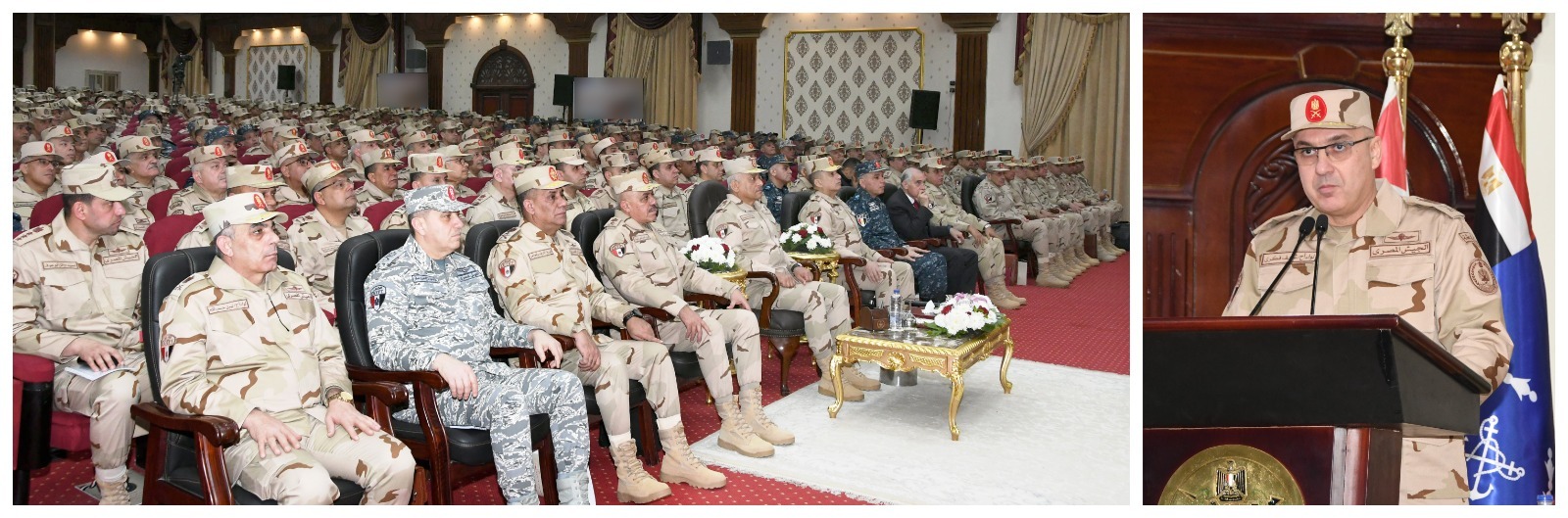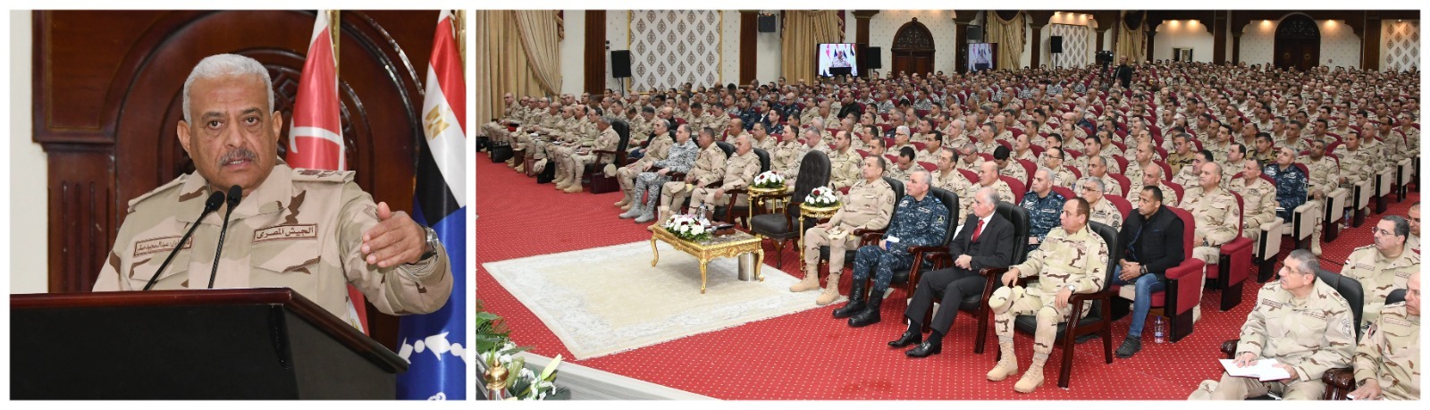 وألقى الفريق أول عبد المجيد صقر القائد العام للقوات المسلحة وزير الدفاع والإنتاج الحربى كلمة نقل خلالها تحيات وتقدير السيد الرئيس عبد الفتاح السيسى رئيس الجمهورية القائد الأعلى للقوات المسلحة وإعتزازه بالجهد الذى يبذله رجال القوات المسلحة فى صون مقدرات الوطن ، مؤكداً على ضرورة قيام القادة والضباط على كافة المستويات بالمحافظة على مستوى الإستعداد القتالى لوحداتهم والإهتمام بالمقاتلين بإعتبارهم الركيزة الأساسية لقواتنا المسلحة ليكونوا قادرين على تنفيذ مختلف المهام الموكلة إليهم بكفاءة وإتقان وروح معنوية عالية , وكذلك أهمية التسلح بالوعى المستنير لما تشهده المرحلة الحالية من تحديات للحفاظ على أمن الوطن وسلامة أراضيه .