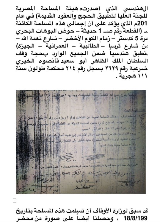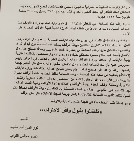 النائب نور أبو ستيت. يكشف فساد الأوقاف ويحذر من التفريط في أرض وقف السلطان الملك الظاهر أبو سعيد قانصوه الخيرى