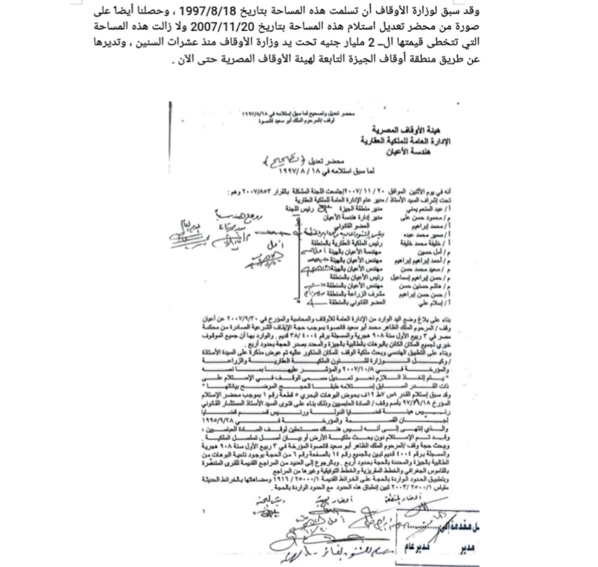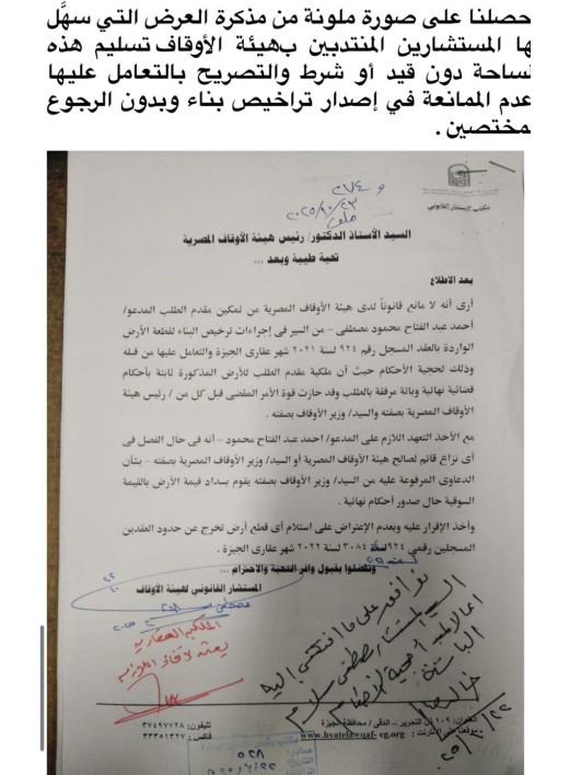 وحذر أبو ستيت من أن المستندات التي حصل عليها تشير إلى محاولات تدليس وإيهام رئيس مجلس إدارة هيئة الأوقاف بأن الأرض تحت يد رجل الأعمال المذكور وأنه حاصل على أحكام نهائية بشأنها، بينما الواقع أن الأرض مملوكة للوقف الخيري بشكل كامل، وأن أي تصريحات أو قرارات بالإذن بالتعامل عليها أو التنازل عنها ستكون باطلة قانونيًا وموضوع مساءلة عاجلة. وأوضح أن الرجل المعني هو ضيف دائم في مكتب المستشارين المنتدبين بالهيئة، مما يثير شبهة المحسوبية والتواطؤ على حساب المال العام وأموال الوقف.