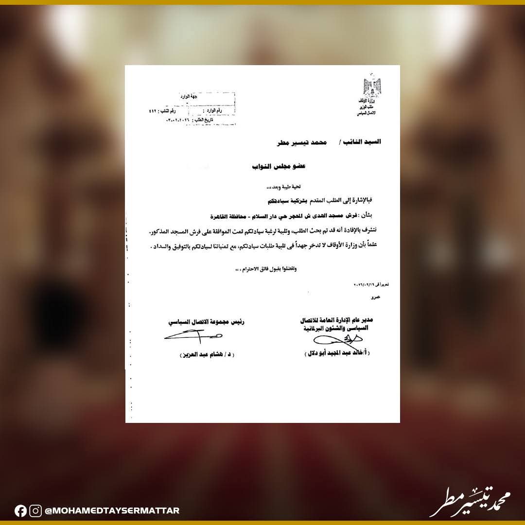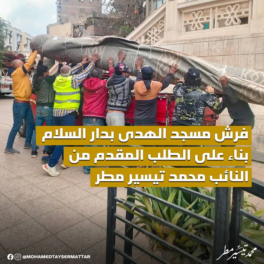 في استجابة فورية وحاسمة لمطالب أهالي حي دار السلام، نجحت جهود النائب محمد تيسير مطر، عضو مجلس النواب وأمين عام حزب إرادة جيل وعضو تنسيقية شباب الأحزاب السياسية، في إتمام عملية فرش وتجديد مسجد "الهدى" بالكامل، وذلك بالتزامن مع حلول خامس أيام شهر رمضان المبارك.