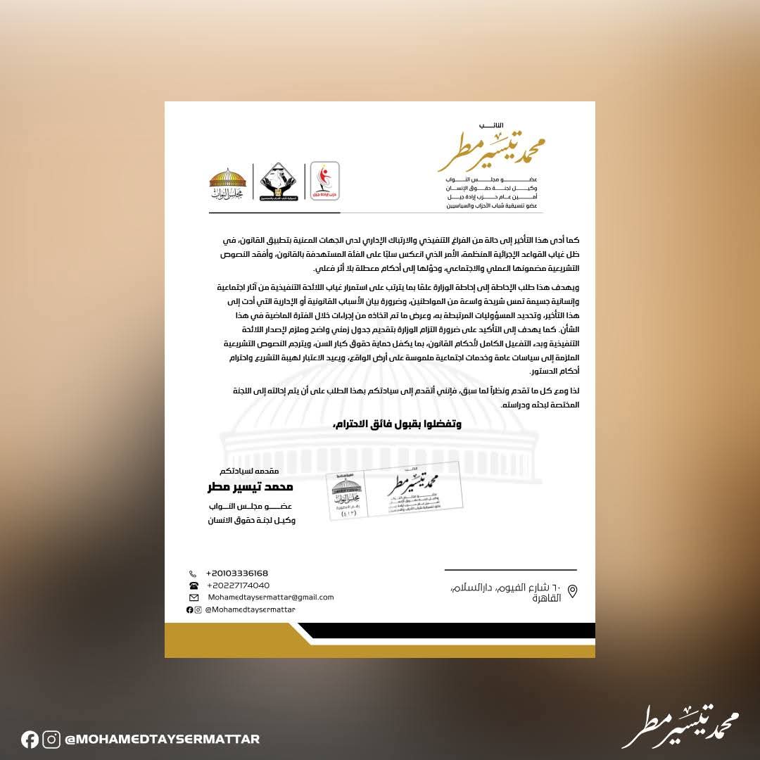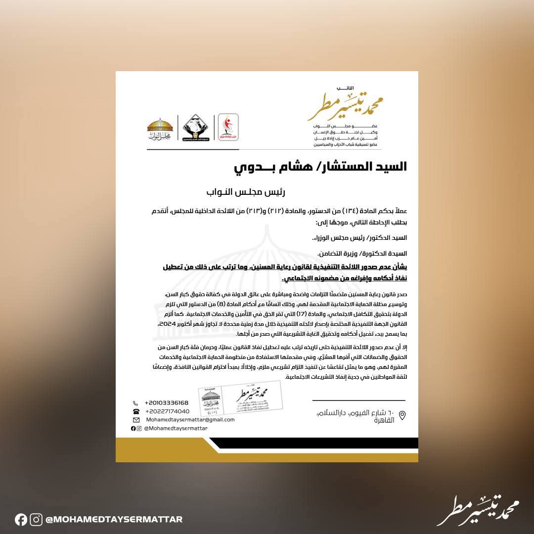 تقدّم النائب محمد تيسير مطر، عضو مجلس النواب ووكيل لجنة حقوق الإنسان، بطلب إحاطة موجه إلى رئيس مجلس الوزراء ووزيرة التضامن الاجتماعي، بشأن عدم صدور اللائحة التنفيذية لقانون رعاية المسنين حتى الآن، رغم انتهاء المدة المحددة لإصدارها في أكتوبر 2024.