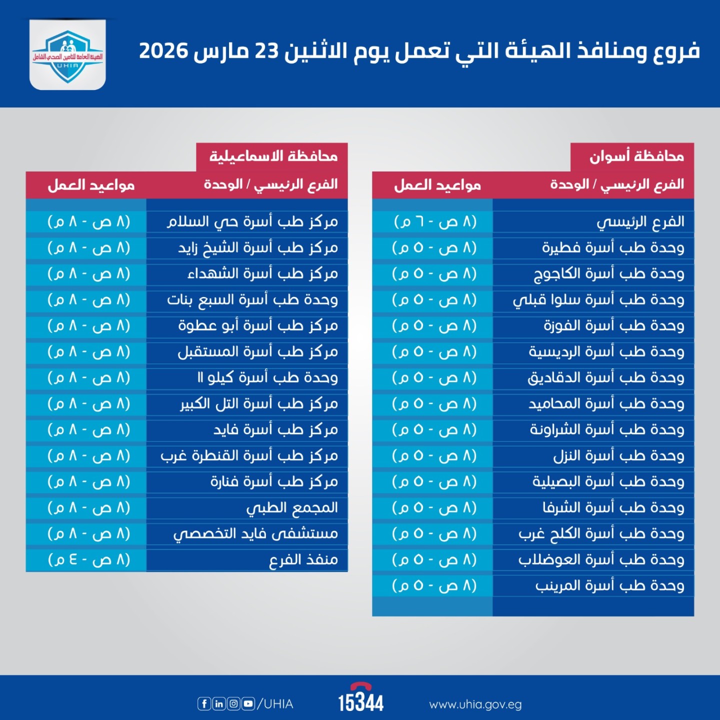 أعلنت الهيئة العامة للتأمين الصحي الشامل، عن مواعيد العمل بفروع الهيئة في عدد من المنافذ بمحافظات تطبيق المنظومة، خلال إجازة عيد الفطر المبارك ٢٠٢٦ وذلك أيام "الخميس والجمعة والسبت والأحد"، في إطار حرص الهيئة على ضمان استمرارية تقديم خدماتها للمستفيدين خلال تلك الفترة.