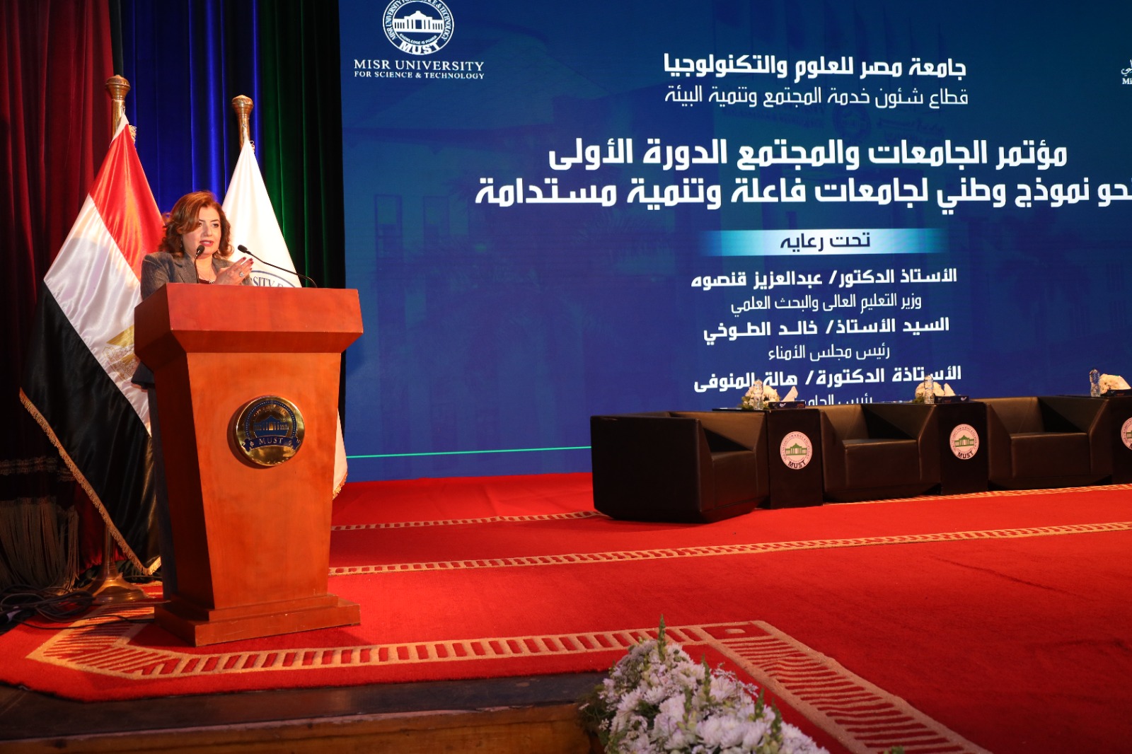 وفي هذا السياق، أكدت الدكتورة هالة المنوفي القائم بأعمال رئيس جامعة مصر للعلوم والتكنولوجيا، أن تنظيم هذا المؤتمر يعكس إيمان الجامعة العميق بأهمية الدور المجتمعي لمؤسسات التعليم العالي، وحرصها على أن تكون جزءا فاعلا في مسار التنمية الوطنية، وأضافت أن الجامعة تسعى من خلال هذه الفعالية العلمية إلى فتح قنوات حوار جاد بين الأكاديميين وصناع القرار وممثلي القطاع الخاص، بما يسهم في صياغة نموذج وطني متكامل لجامعات أكثر تأثيرا وارتباطا بقضايا المجتمع، مؤكدة أن المرحلة الحالية تتطلب إعادة توجيه البحوث العلمية نحو التطبيق العملي، بما يحقق قيمة مضافة حقيقية للاقتصاد الوطني.