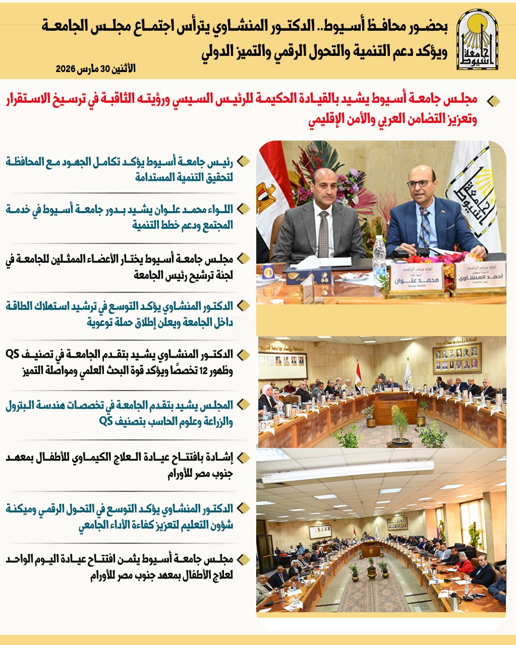 - مجلس جامعة أسيوط يشيد بالقيادة الحكيمة للرئيس السيسي ورؤيته الثاقبة في ترسيخ الاستقرار وتعزيز التضامن العربي والأمن الإقليمي
