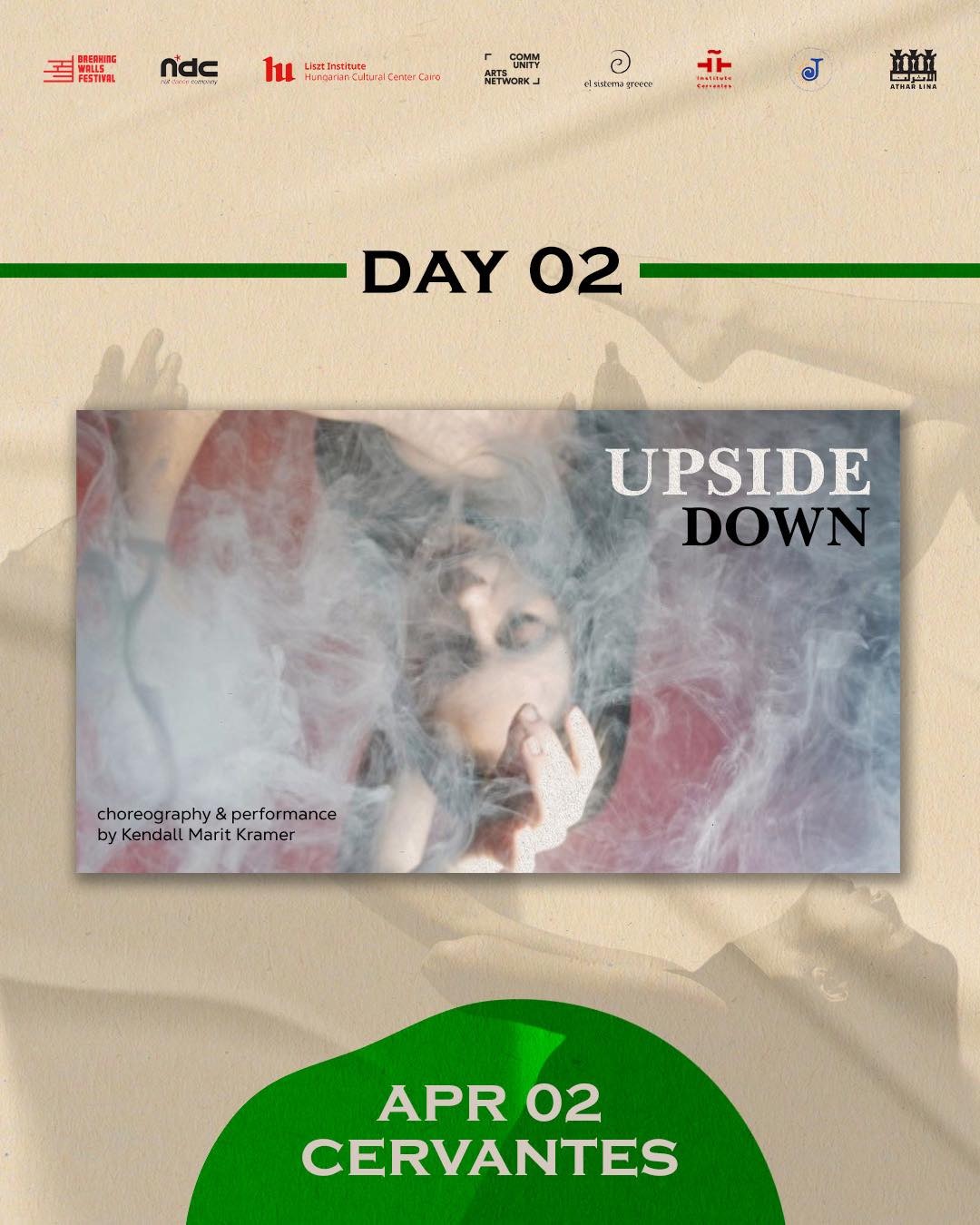 العرض الأول بعنوان "رأساً على عقب" للفنانة كيندال كرامر، وهو عمل قصير (٨ دقائق) يستكشف رحلة وجدانية بين الندم والفهم، حيث تتحول أخطاء الماضي إلى وعي جديد وفرص للتواصل الأعمق مع الذات والآخرين. أما العرض الثاني "علامة استفهام" (٣٠ دقيقة) للفنان خالد جيكا، فيأخذ الجمهور في رحلة مسرحية ارتجالية تبدأ بسؤال وجودي وتتطور عبر سلسلة من التساؤلات حول المعنى والمصير، في بحث مفتوح عن إجابات قد لا تكون نهائية. ويختتم البرنامج بعرض "أساسي" (١٧ دقيقة) للفنانة خلود عيسى، الذي يدمج المسرح الجسدي مع قصص إنسانية لنساء من السودان ولبنان وسوريا، يروين تجاربهن مع الحرب والنجاة، مصحوبة بأغانٍ من الفلكلور الشعبي، مما يثري البعد الثقافي والوجداني للعمل.