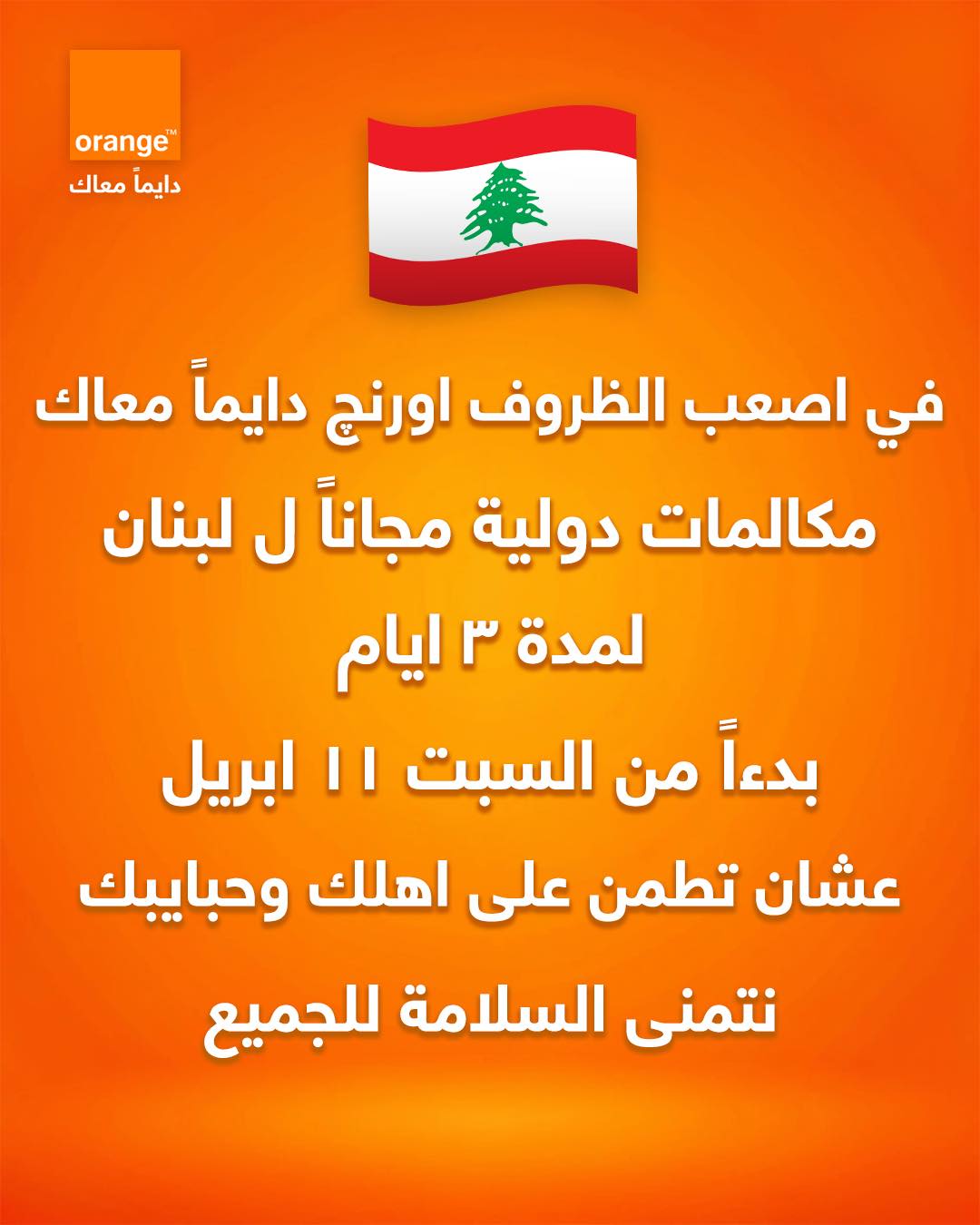 أعلنت شركة أورنـج مصر على مساندة ودعم عملائنا للاطمئنان على سلامة ذويهم في ظل الاحداث الراهنة ليك ٥ دقائق دولية لمدة ٣ ايام ابتداء من غدا السبت ١١ ابريل - هذه المبادرة بالتعاون مع الجهاز القومي لتنظيم الإتصالات - تطبق الشروط والاحكام