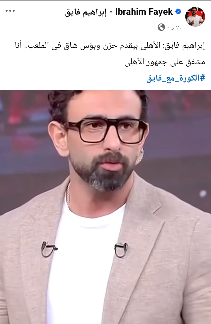 وكتب الإعلامي إبراهيم فايق عبر حسابه علي فيسبوك "الأهلى بيقدم حزن وبؤس شاق فى الملعب.. أنا مشفق على جمهور الأهلى"