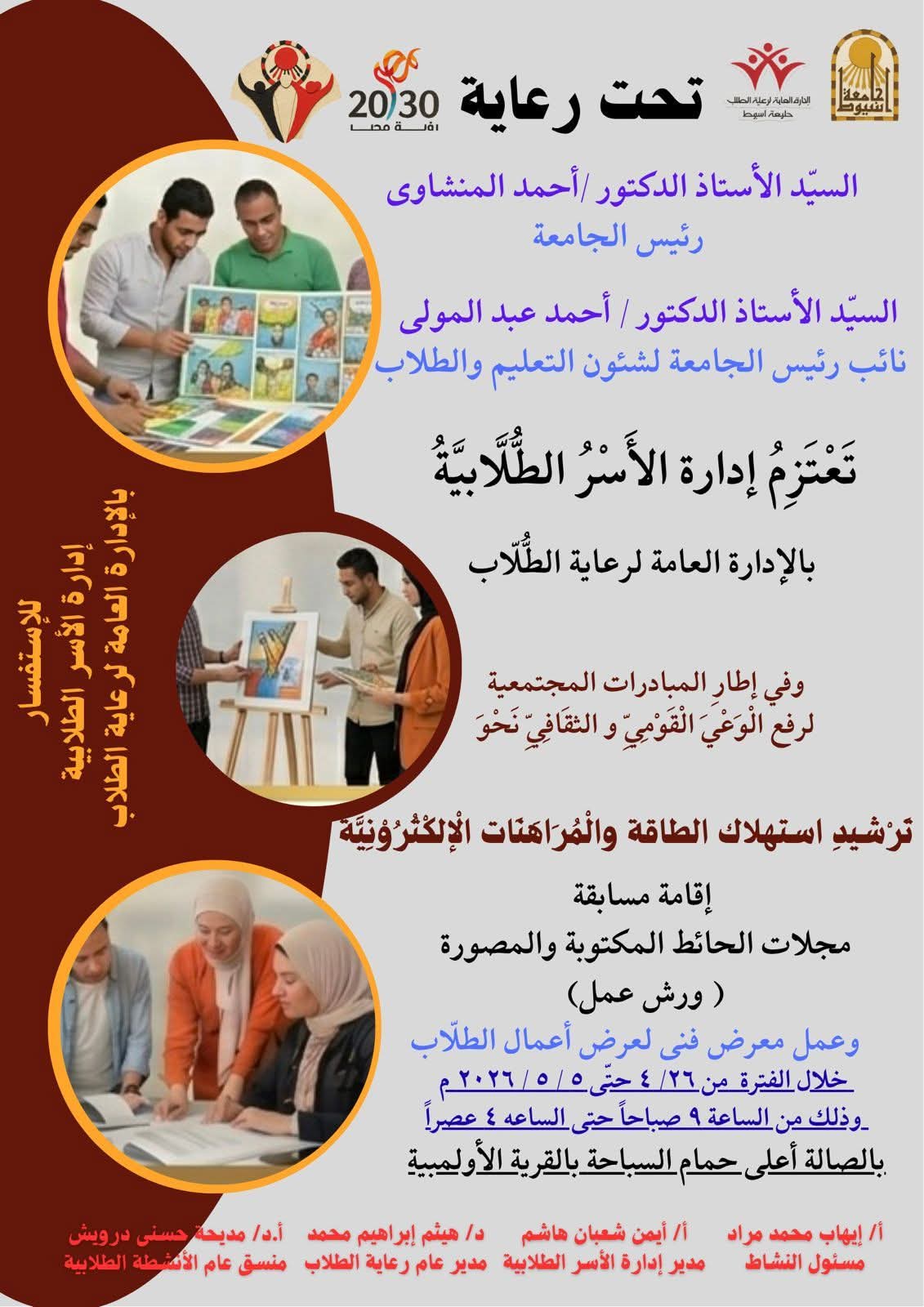 تحت رعاية الدكتور أحمد المنشاوي رئيس الجامعة، وبإشراف الدكتور أحمد عبد المولى نائب رئيس الجامعة لشئون التعليم والطلاب، تُنظم إدارة الأسر الطلابية بالإدارة العامة لرعاية الطلاب بجامعة أسيوط مجموعة من الفعاليات الطلابية المتنوعة، في إطار المبادرات المجتمعية الهادفة إلى رفع الوعي القومي والثقافي لدى الطلاب.