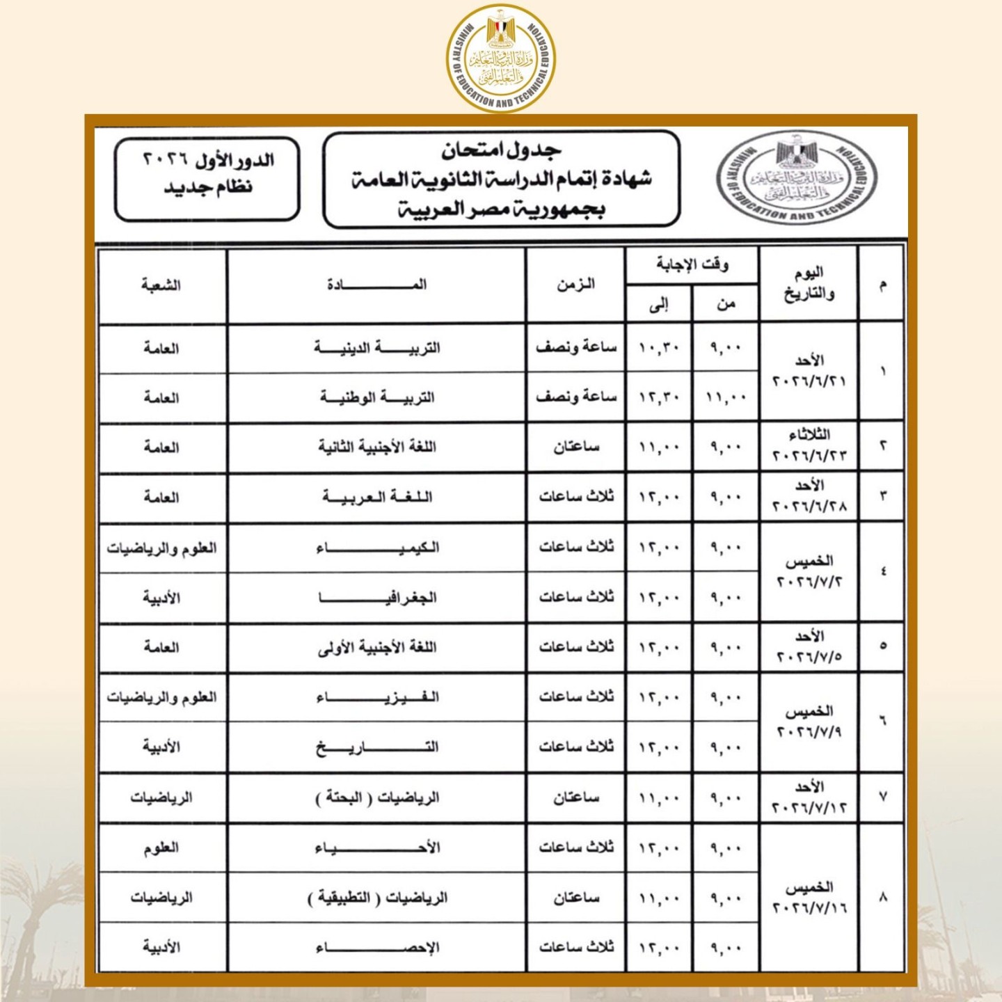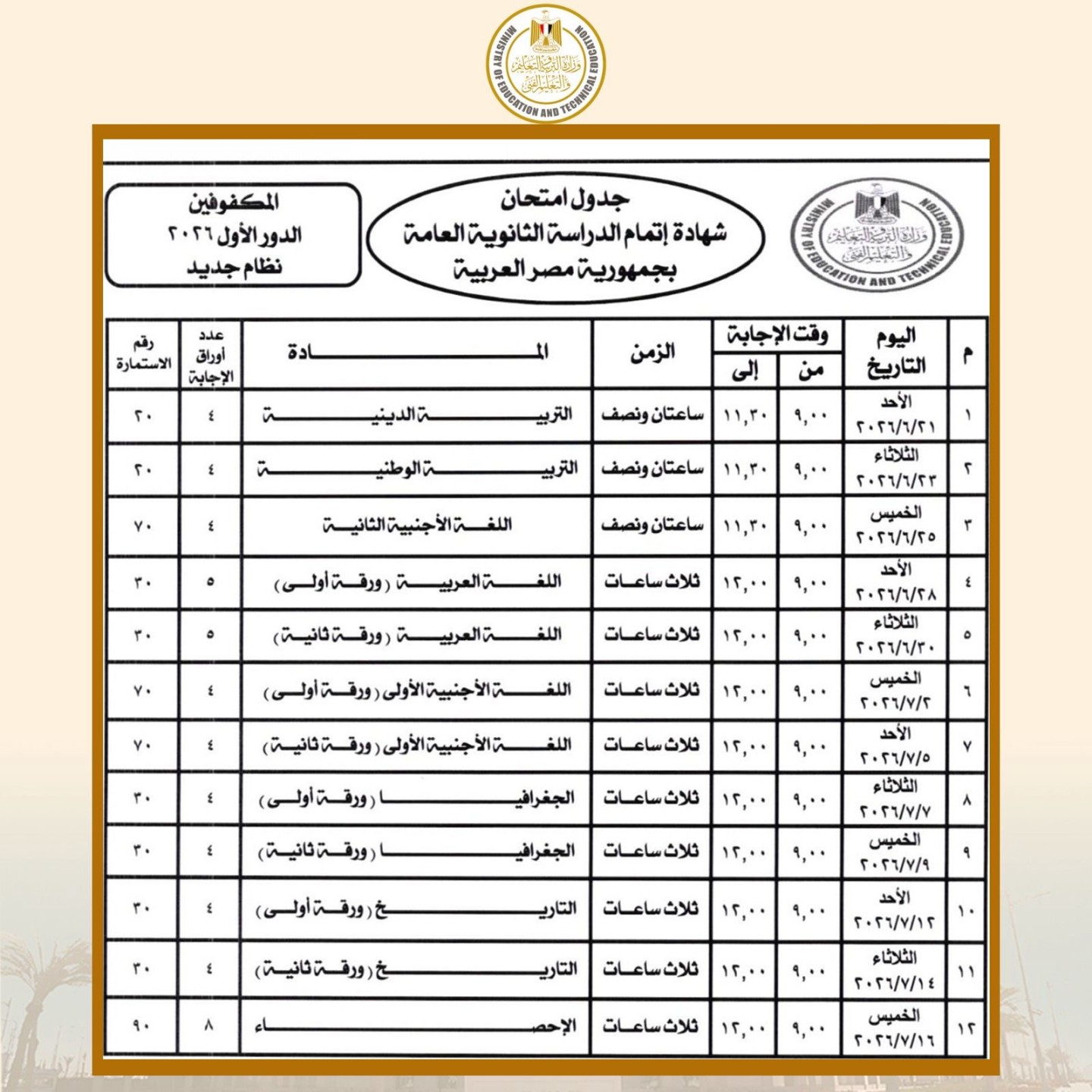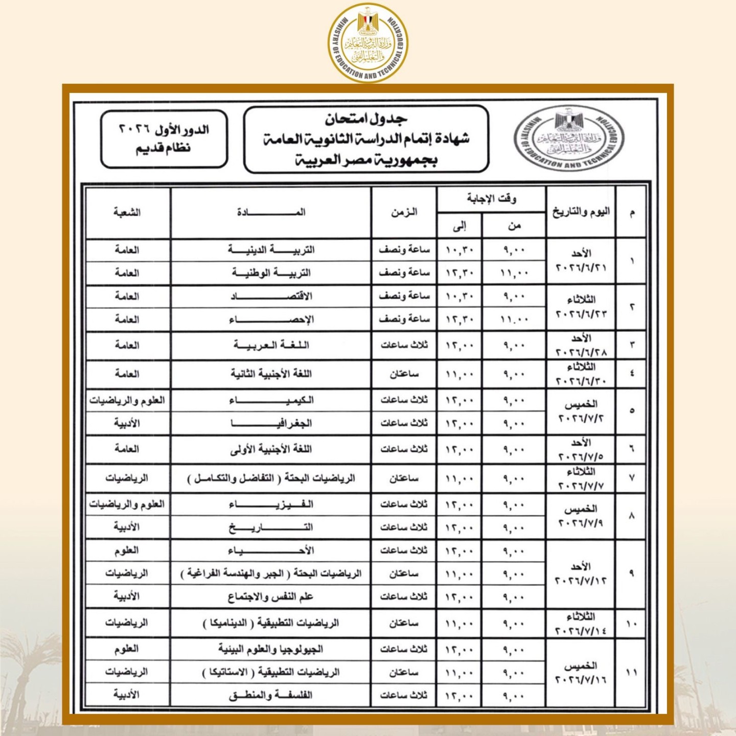 وبحسب الجداول المعتمدة ، تبدأ امتحانات الثانوية العامة للدور الأول (نظام جديد - نظام قديم) والمكفوفين يوم الأحد الموافق 21 يونيو 2026، وتستمر حتى يوم الخميس 16 يوليو 2026.