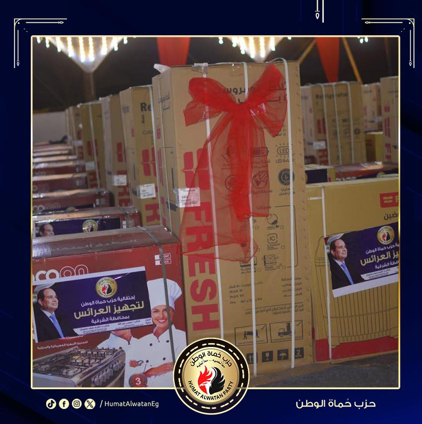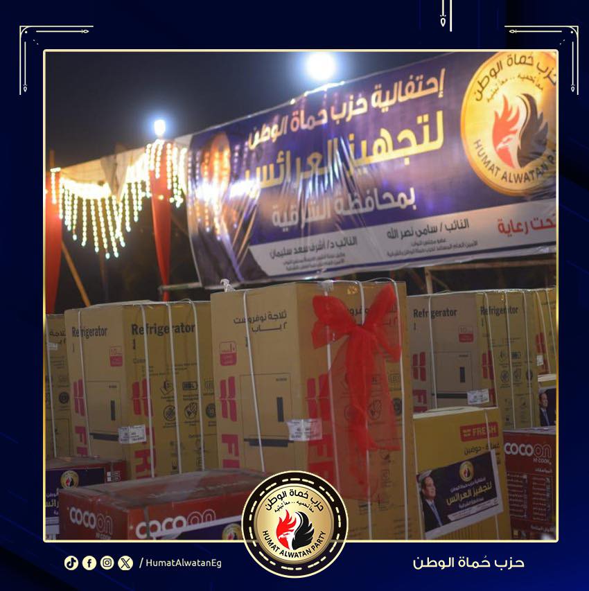 نظم حزب حماة الوطن احتفالية لتجهيز عدداً كبيراً من العرائس المقبلين على الزواج، بمدينة بلبيس بمحافظة الشرقية، في إطار مبادرات الحزب المجتمعية لدعم الشباب.