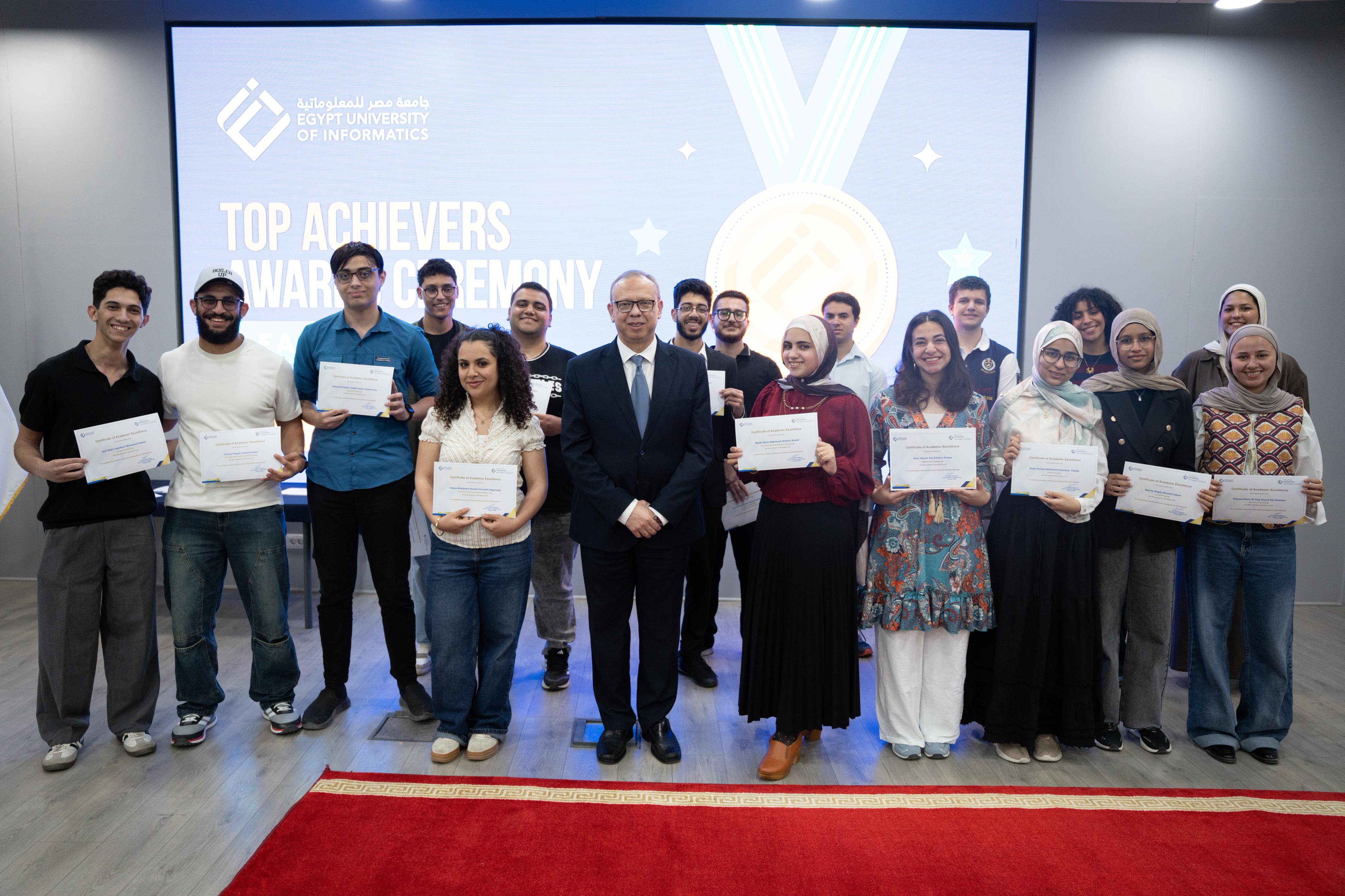 واكد الأستاذ الدكتور أحمد حمد القائم بأعمال رئيس جامعة مصر للمعلوماتية، ان الاحتفال بيوم المتفوقين يمثل مسار فريد تسير عليه الجامعة منذ تأسيسها عام 2021 والقائم على رعاية واحتضان المتفوقين في شتى المجالات، مع توفير البيئة الخصبة لنمو وازدهار تفوقهم واستثماره في ريادة الاعمال بما يضمن لخريجينا الاستمرار في التقدم.